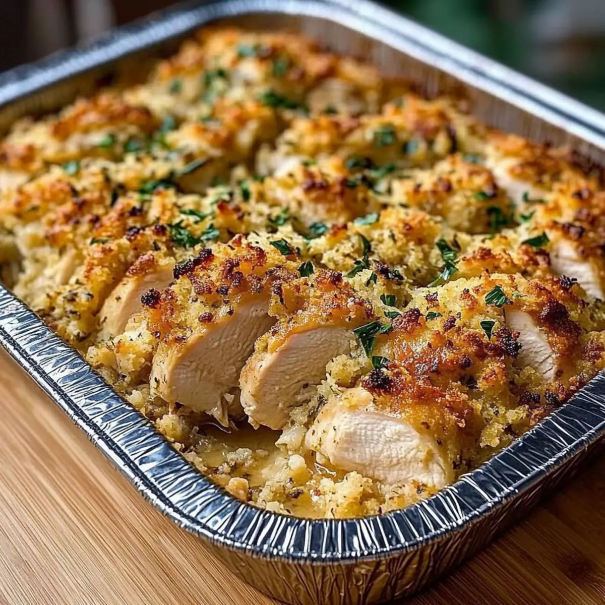 Cover the baking dish with aluminum foil and place it in the preheated oven. Bake for 25 minutes to allow the flavors to meld and the chicken to cook through. After 25 minutes, carefully remove the foil and continue baking for an additional 15-20 minutes, or until the stuffing is golden and the chicken reaches an internal temperature of 165°F (74°C).