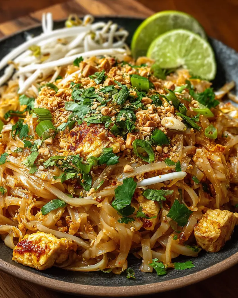 - Serve the Pad Thai hot, garnished with chopped peanuts and lime wedges on the side.