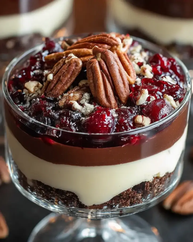 Baileys Chocolate Cheesecake Trifle with Cranberry Sauce & Pecans is a decadent dessert that combines rich chocolate cheesecake layers with tart cranberry sauce and crunchy pecans.