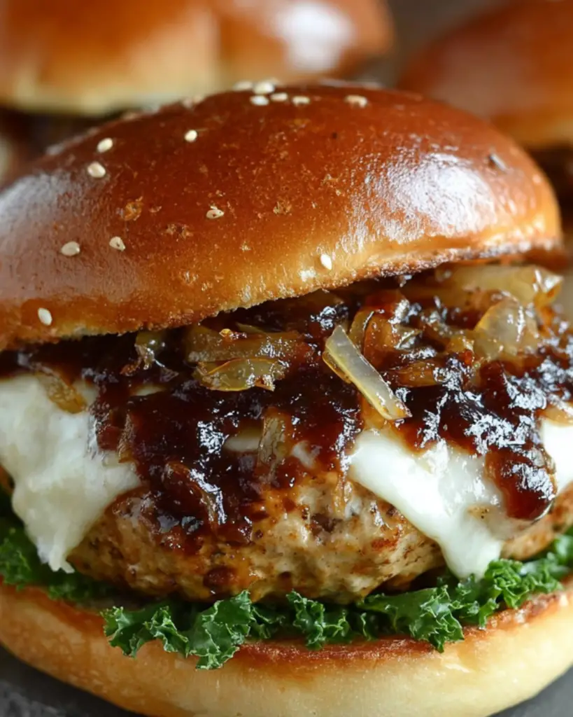 Delicious turkey burgers topped with balsamic caramelized onions, perfect for a healthy meal.