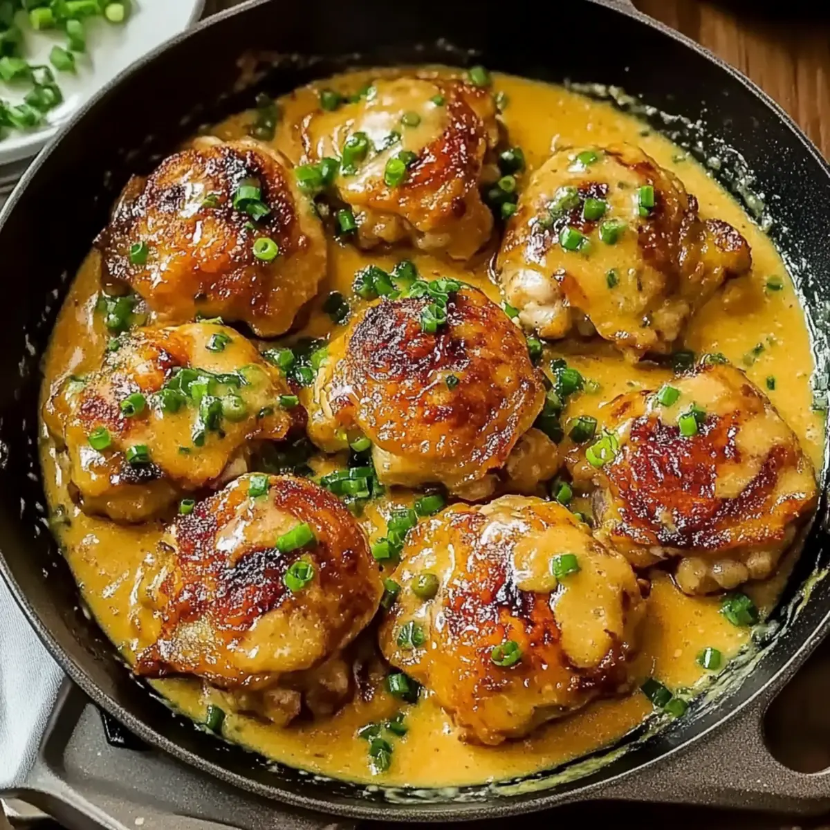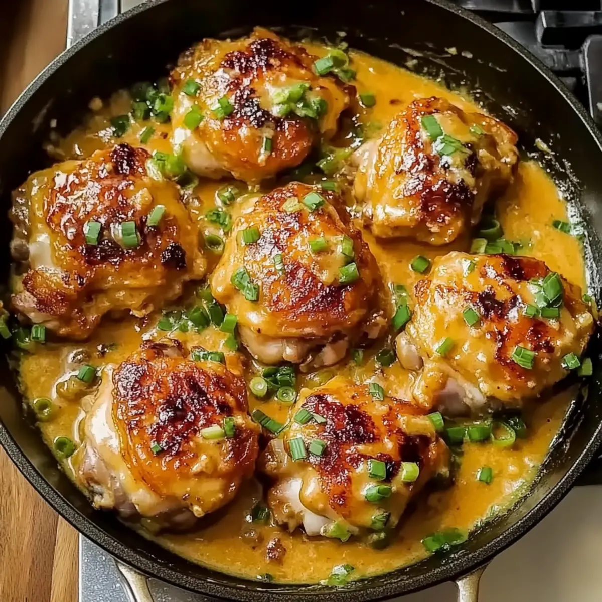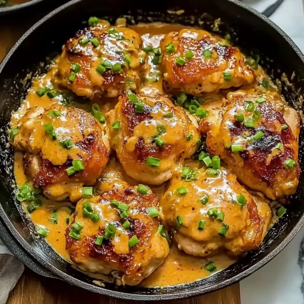 Return the chicken thighs to the skillet, ensuring each piece is thoroughly coated in the rich bang bang sauce. Toss gently to combine, allowing the sauce to cling to every delicious bite. For the final touch, garnish your dish with vibrant green onions, adding a fresh pop of color and flavor that complements the creamy sauce beautifully.