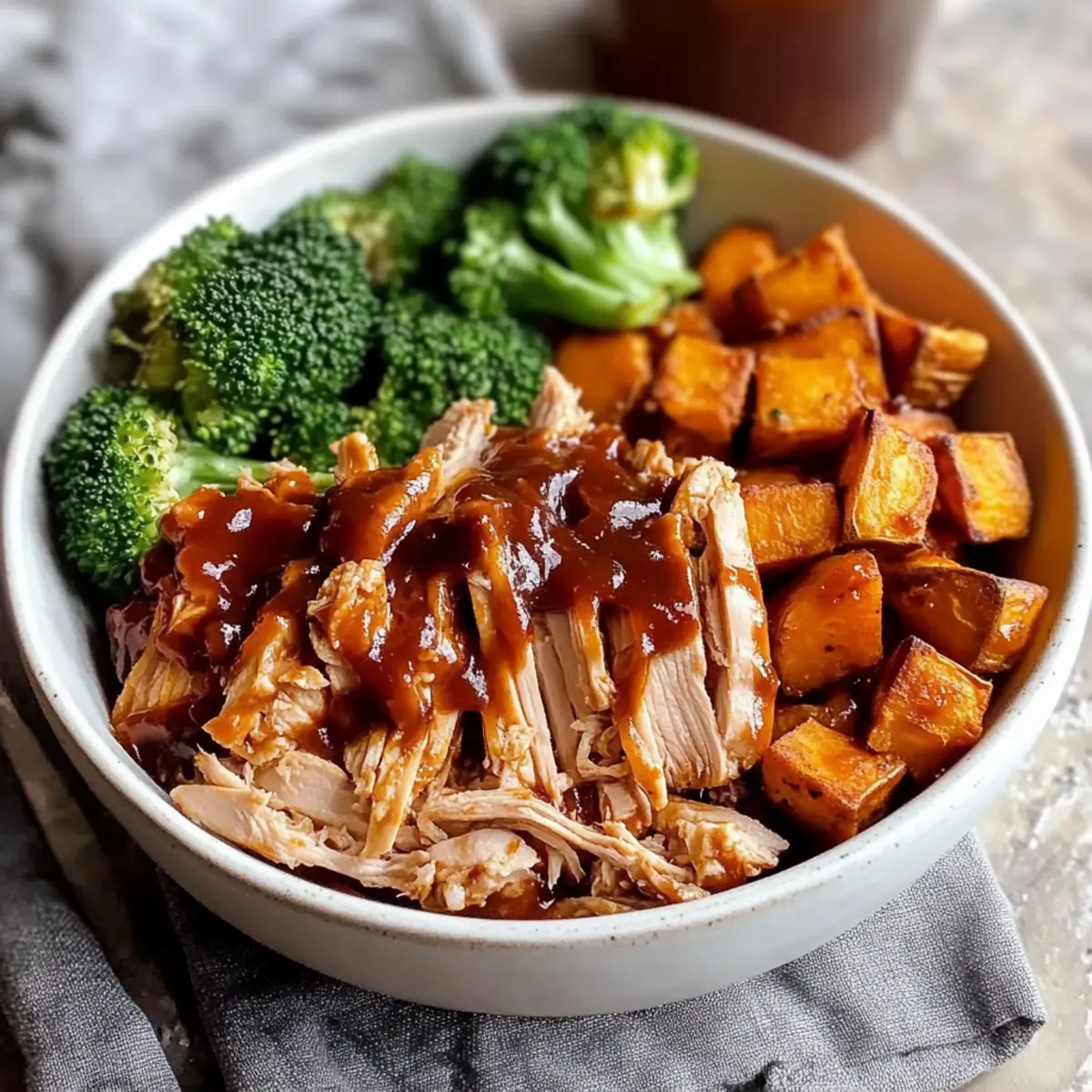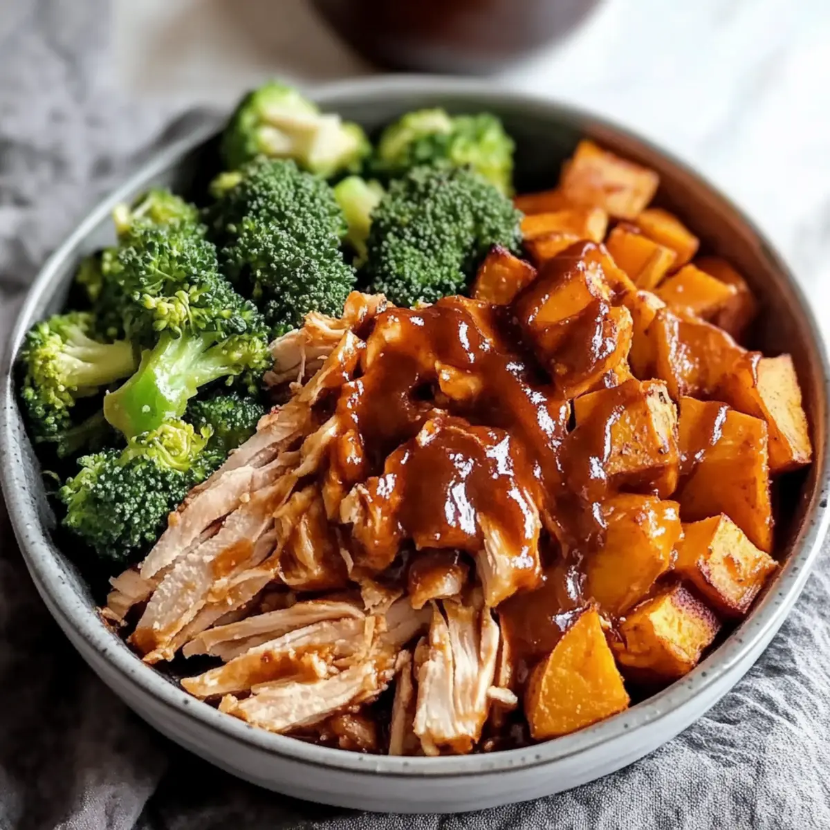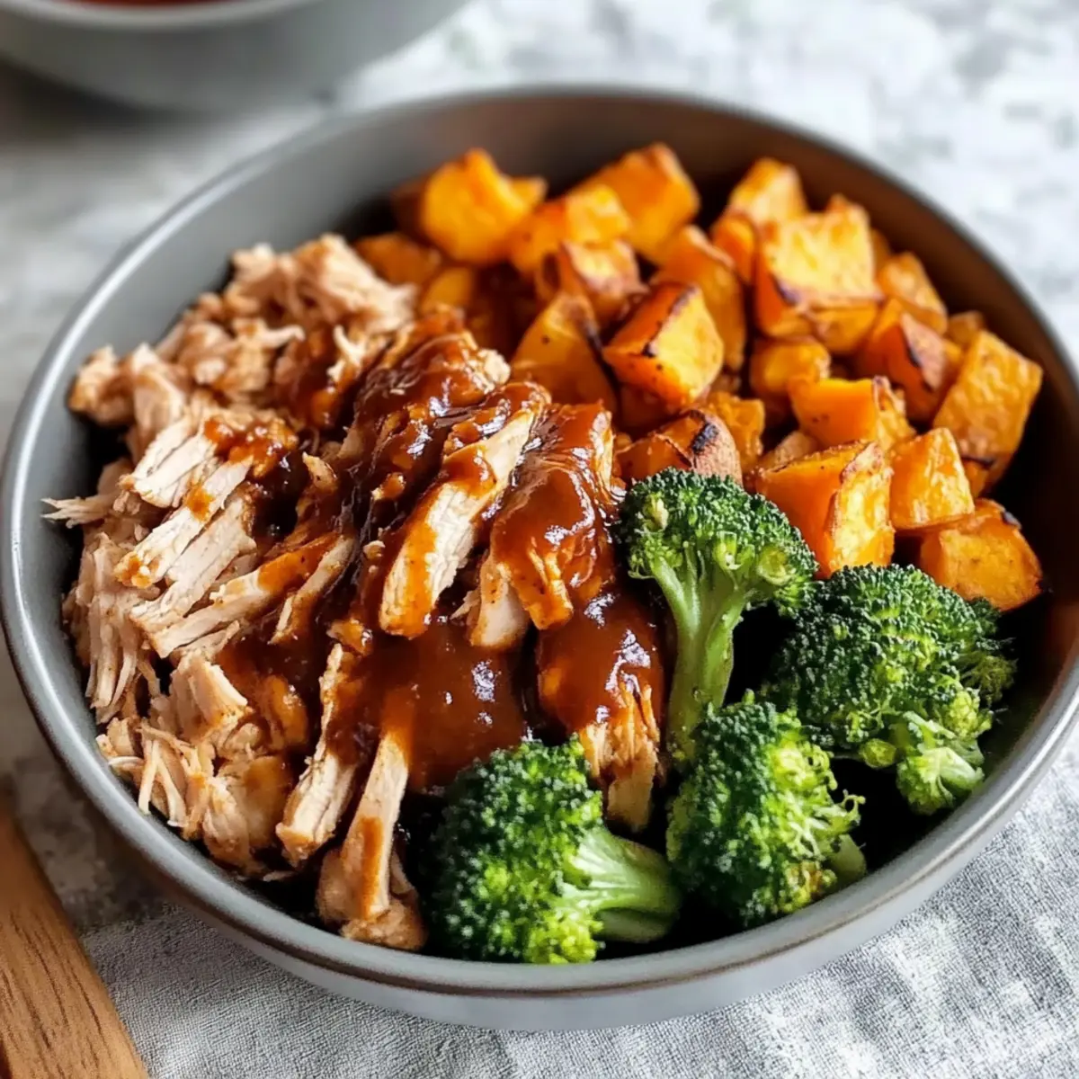 Once cooked, remove the baking sheet from the oven and let the chicken rest for a minute. Shred the chicken directly on the pan with a couple of forks, mixing it with the remaining BBQ sauce to coat. Finally, divide the mixture evenly into bowls, layering the shredded chicken, roasted sweet potatoes, and broccoli, then serve warm for a satisfying meal.