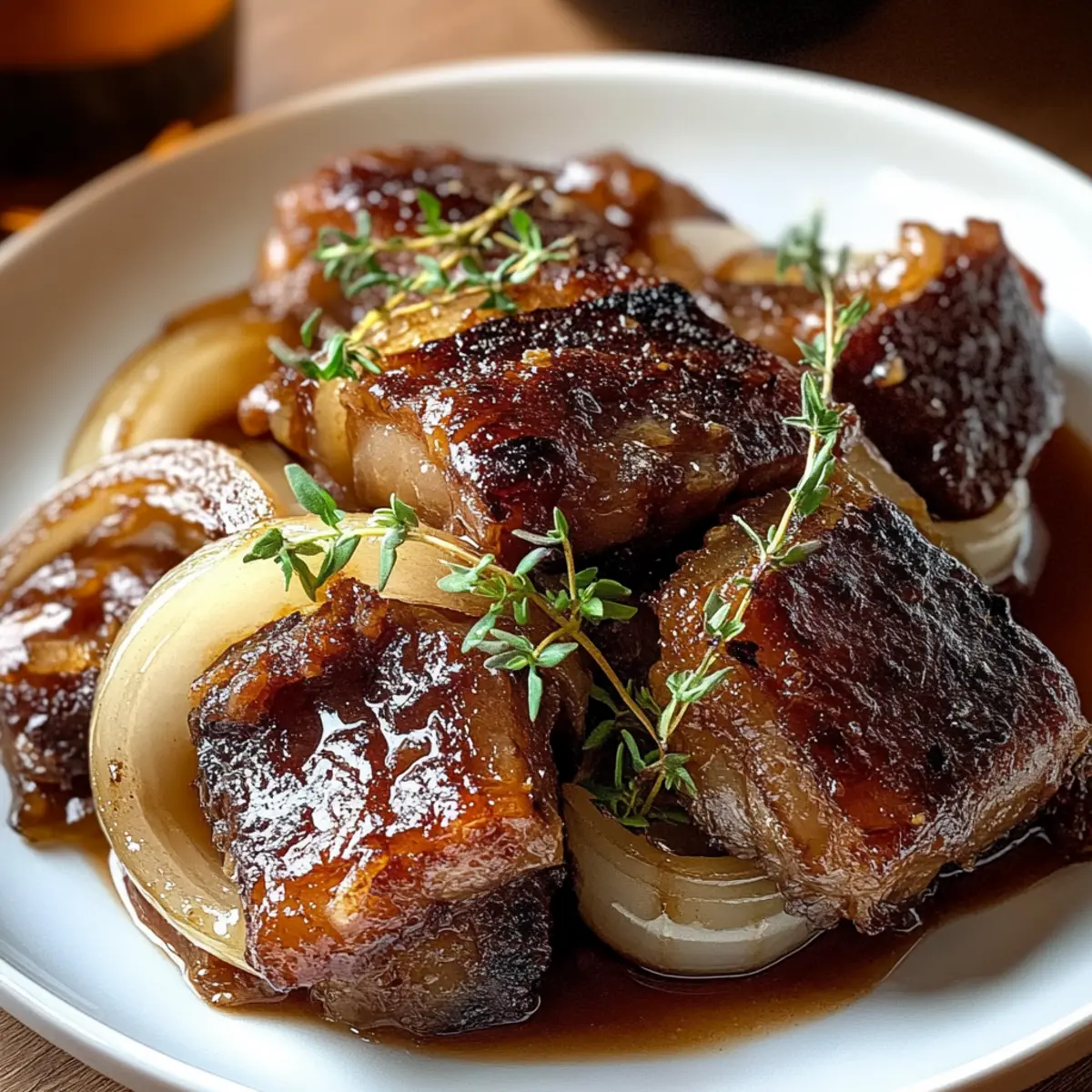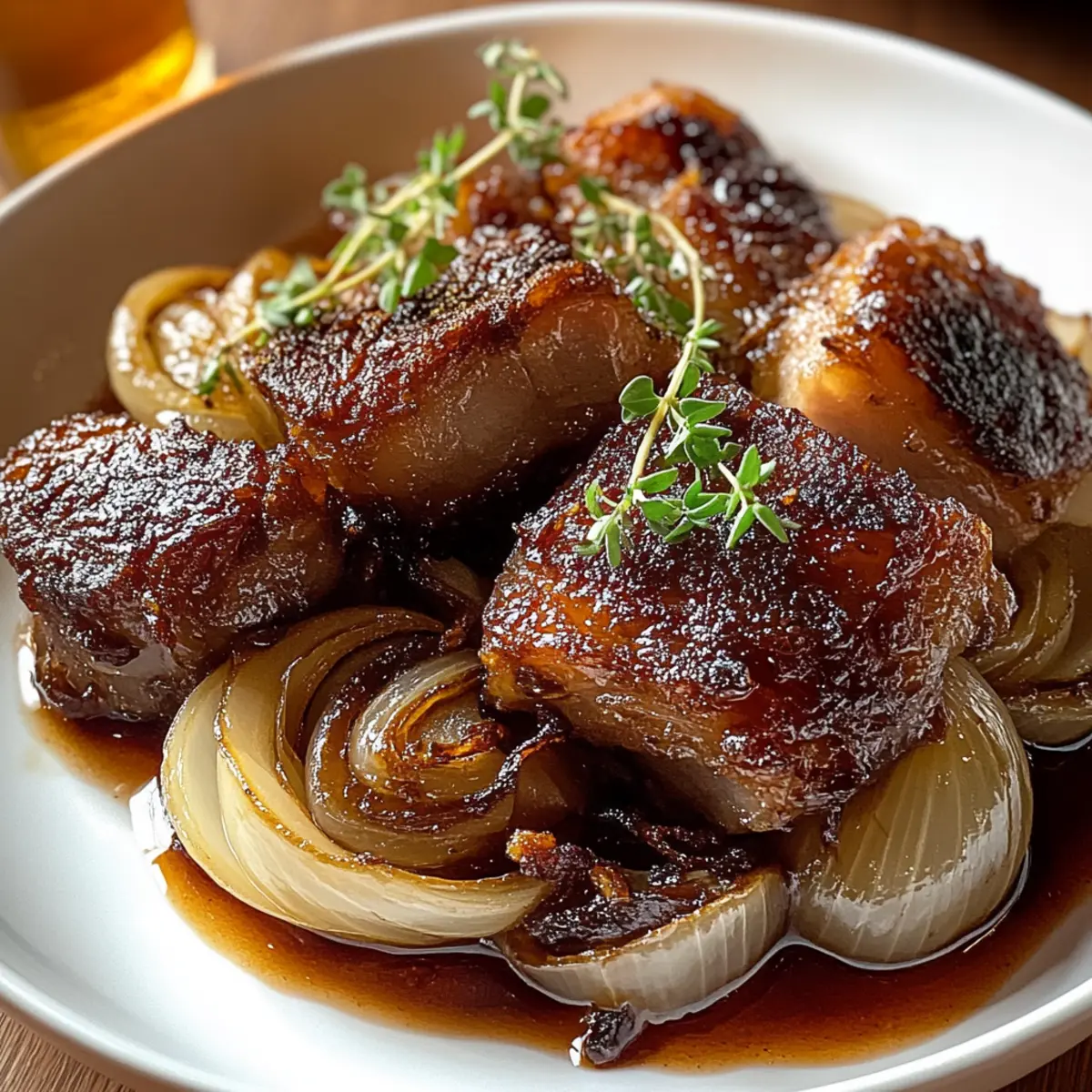 To serve, arrange the crispy salt pork on a platter, generously topping it with the luscious beer-glazed onions. For a fresh touch, you can optionally garnish with fresh thyme leaves, adding an aromatic element that elevates this comforting dish. Enjoy the hearty goodness of Beer Glazed Onions and Salt Pork!