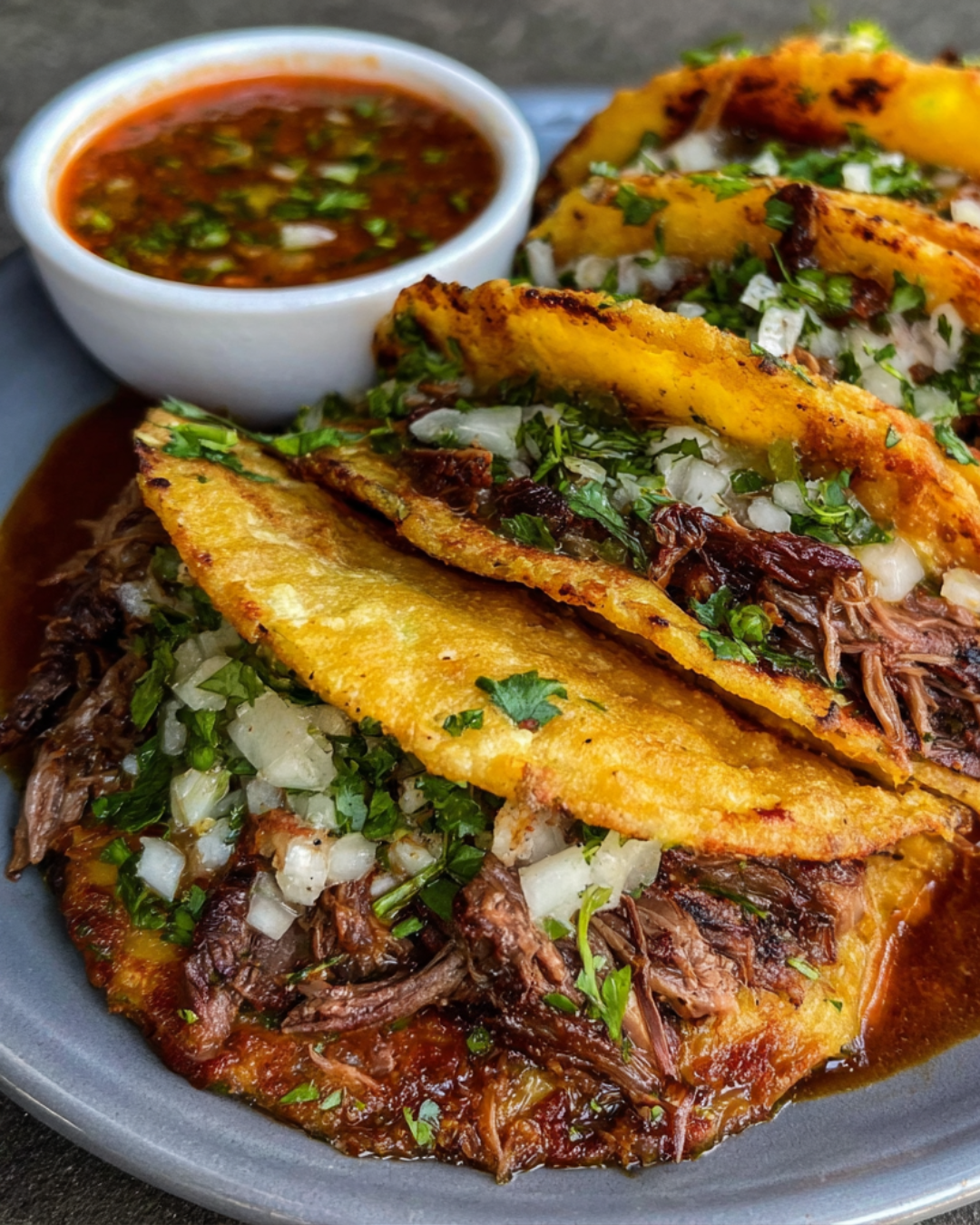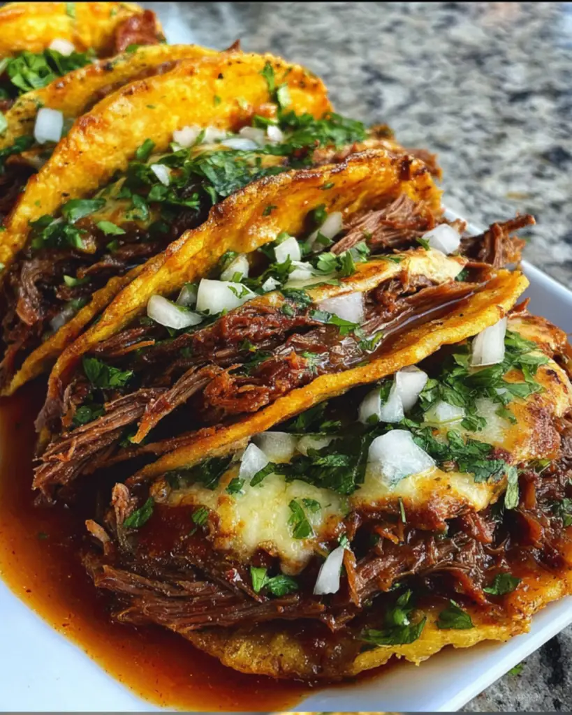 Birria Tacos are a delicious Mexican dish made with tender, flavorful beef and served in warm corn tortillas, perfect for dipping in a rich broth.