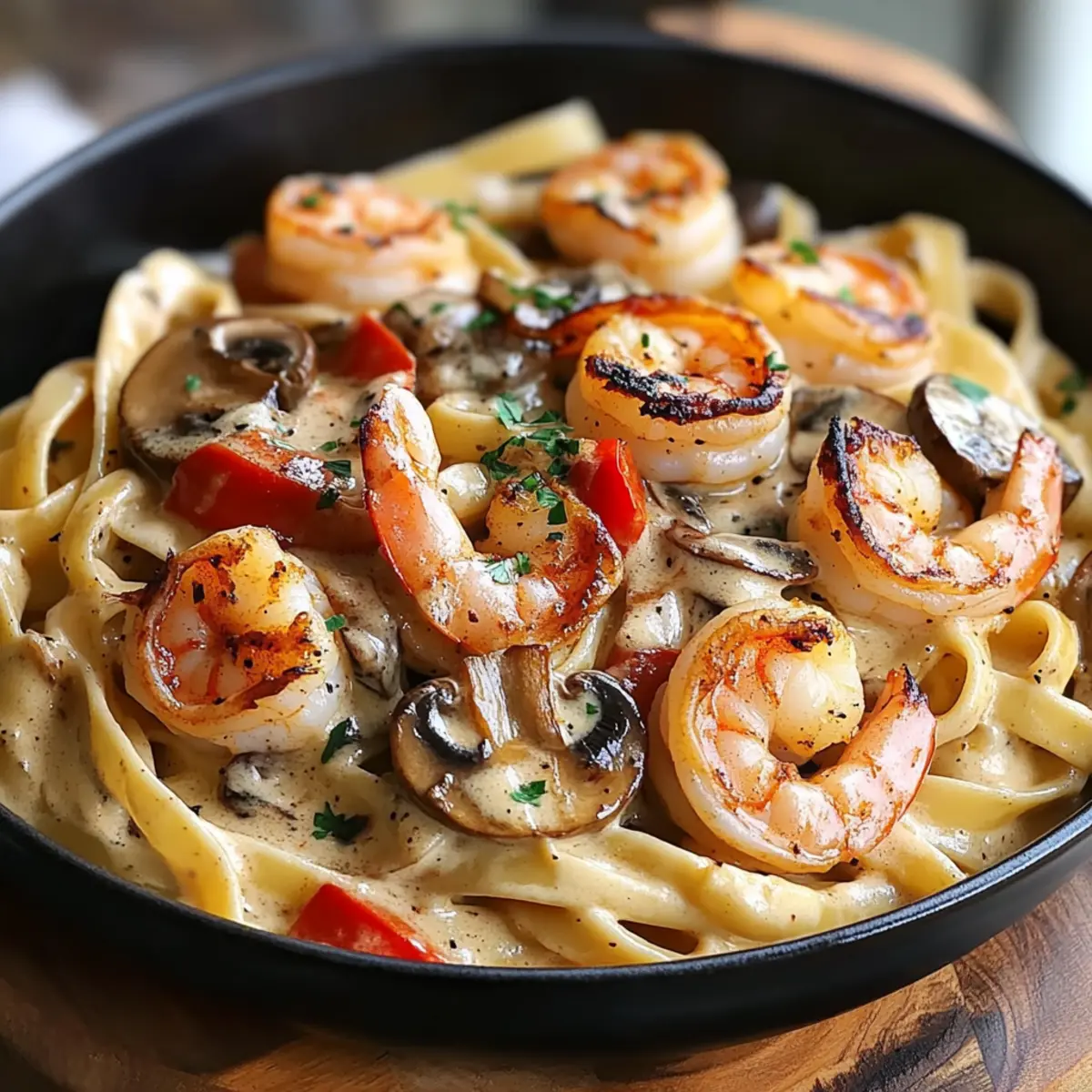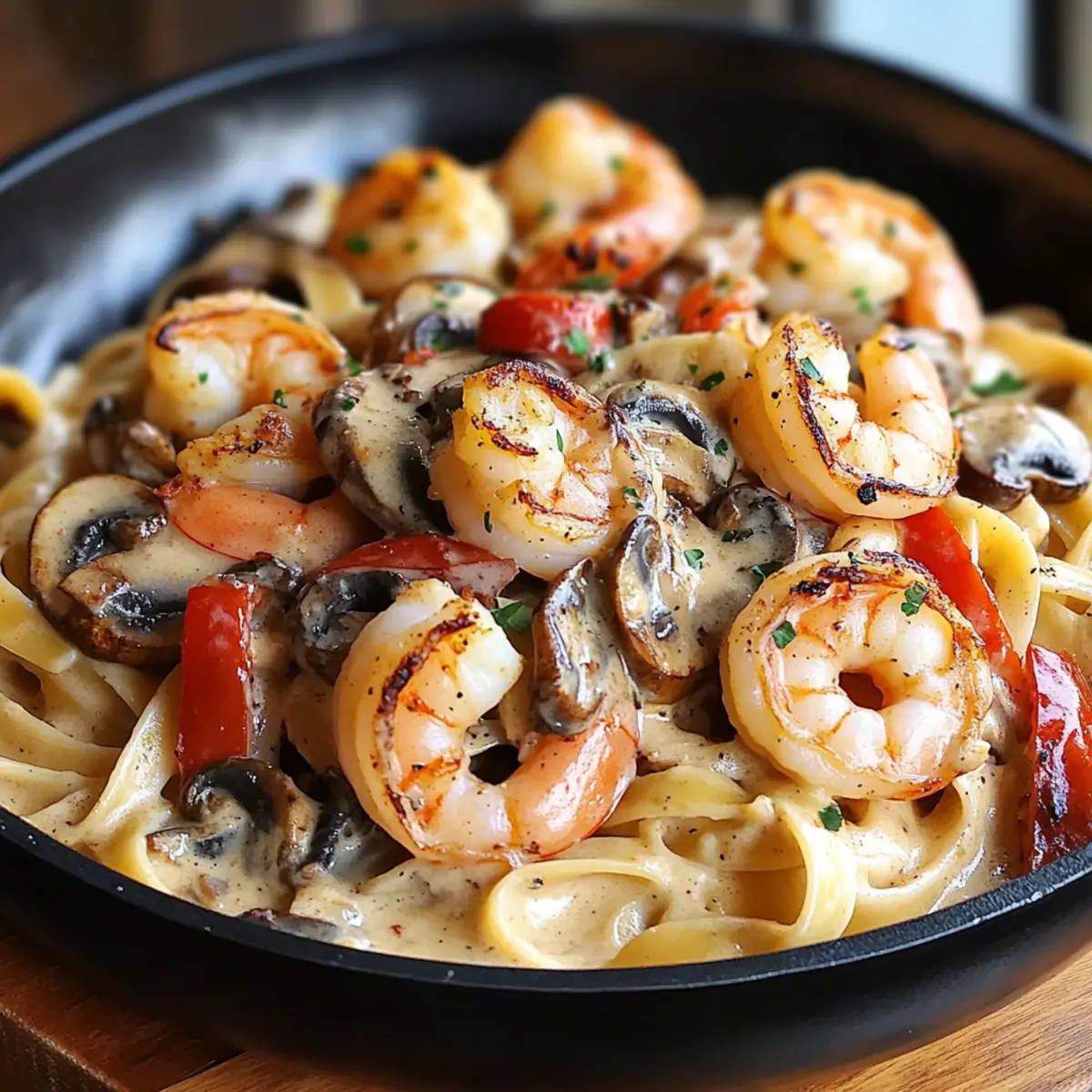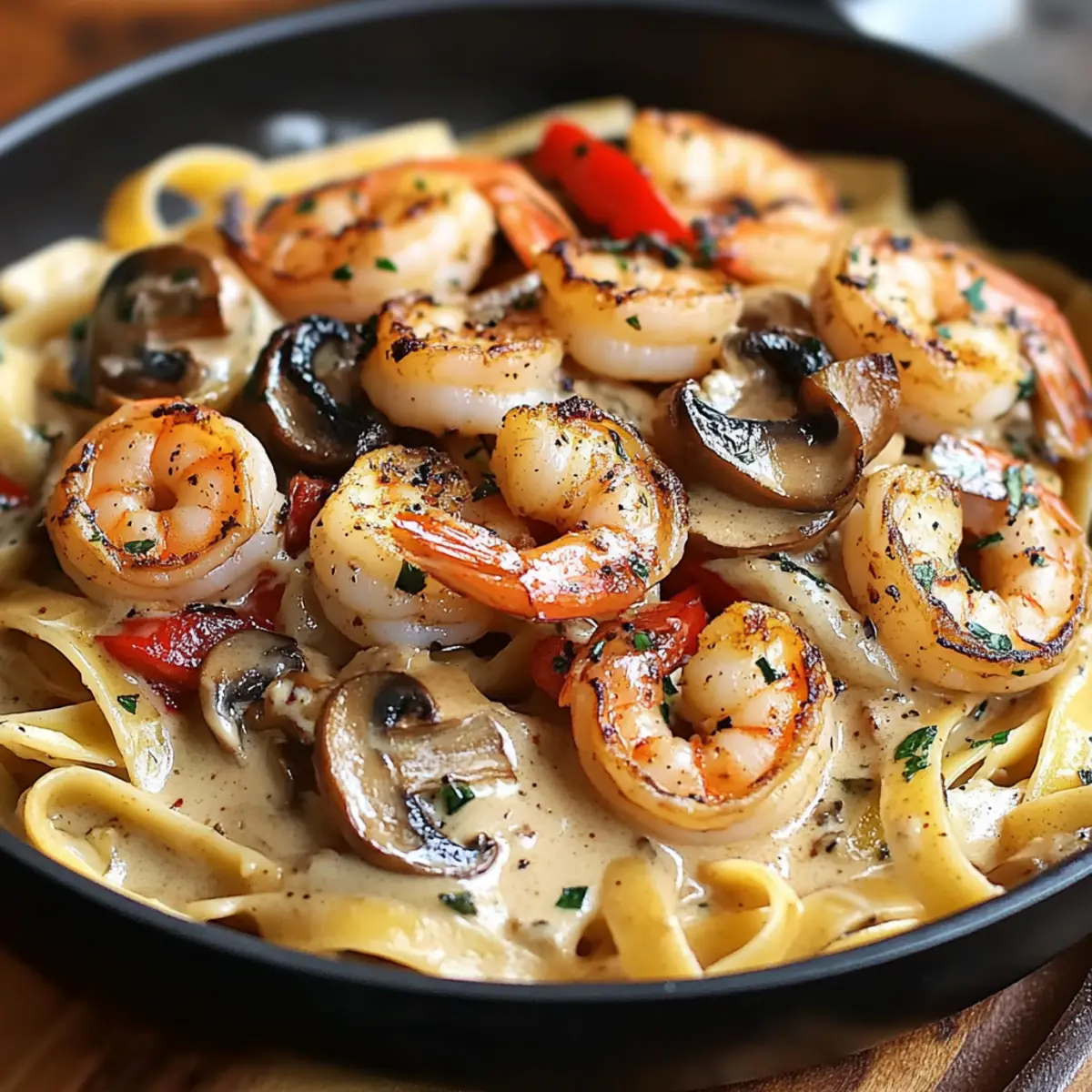 - Combine sautéed mushrooms, shrimp, roasted red bell peppers, and capers into the sauce. Stir gently, season with salt and pepper, and heat through.