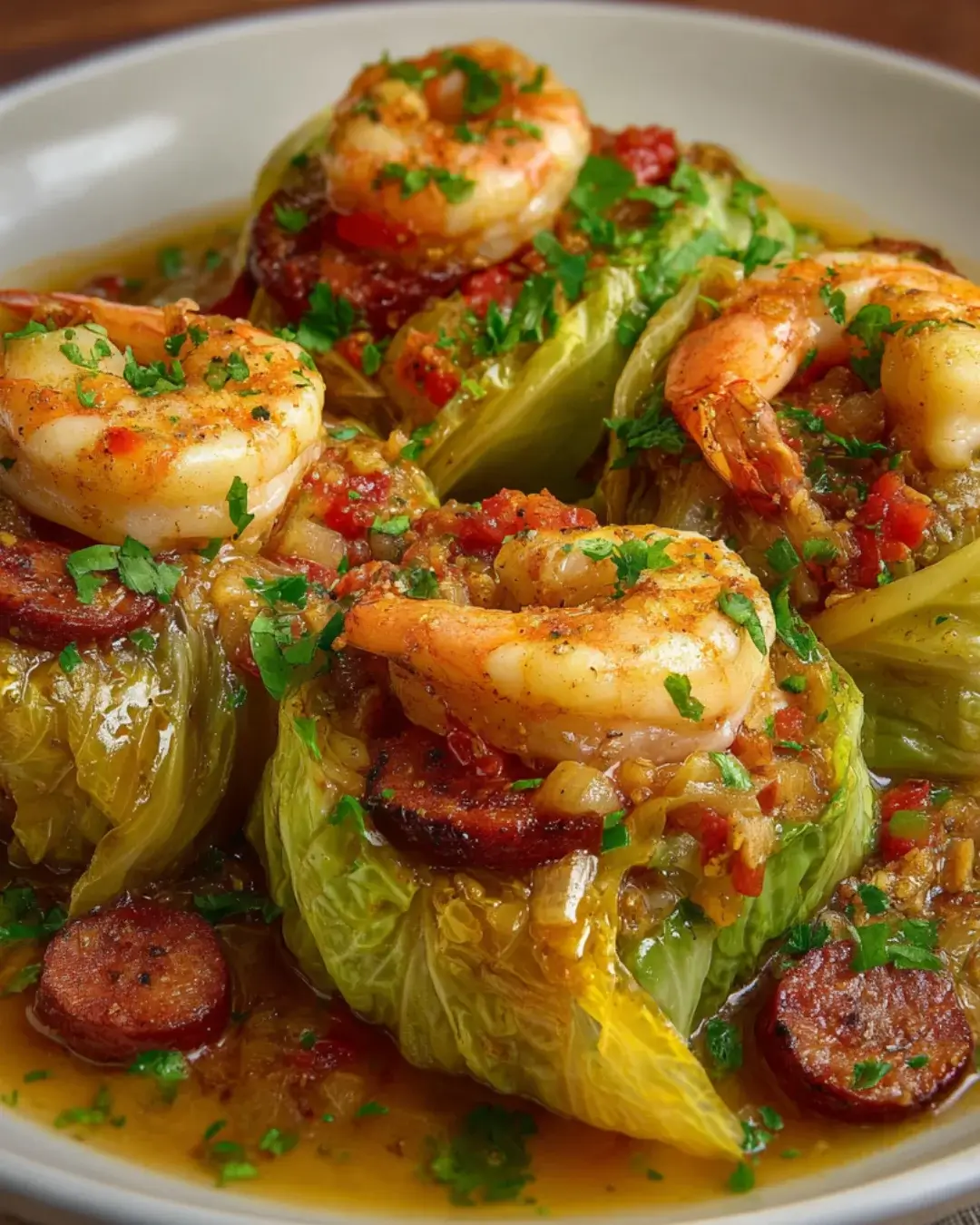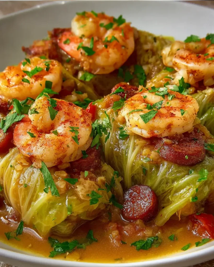 A delicious Cajun-inspired dish featuring shrimp and sausage stuffed into cabbage leaves, baked to perfection.