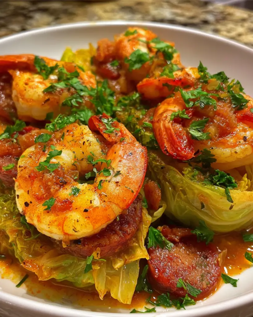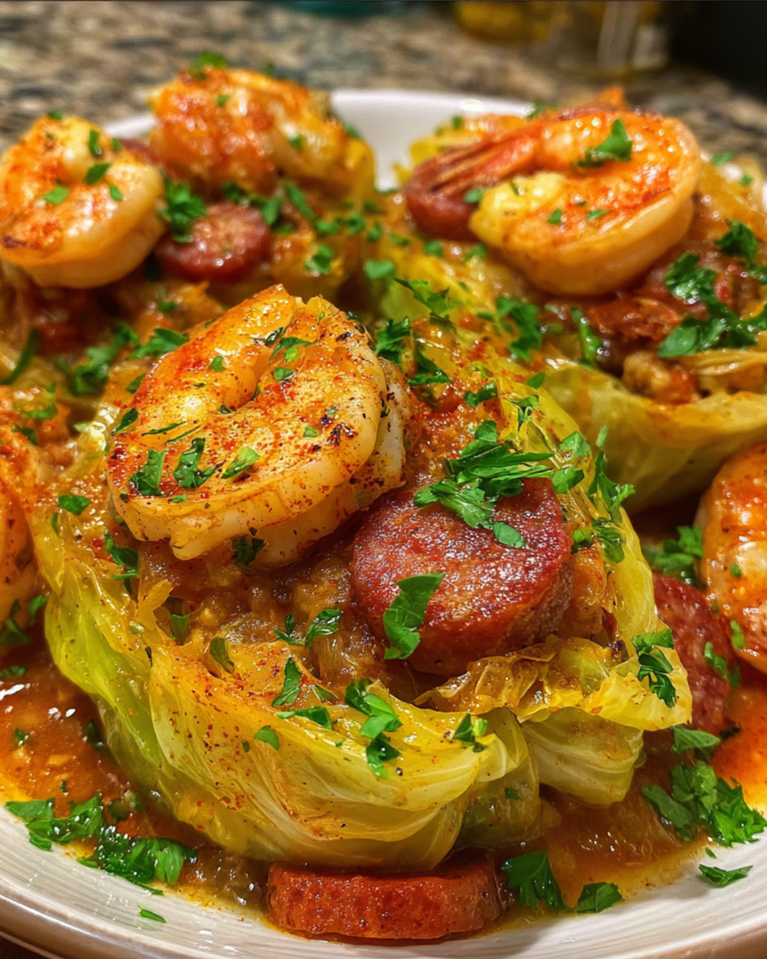 The combination of succulent shrimp and smoky sausage wrapped in tender cabbage creates a flavor explosion that’s hard to resist.