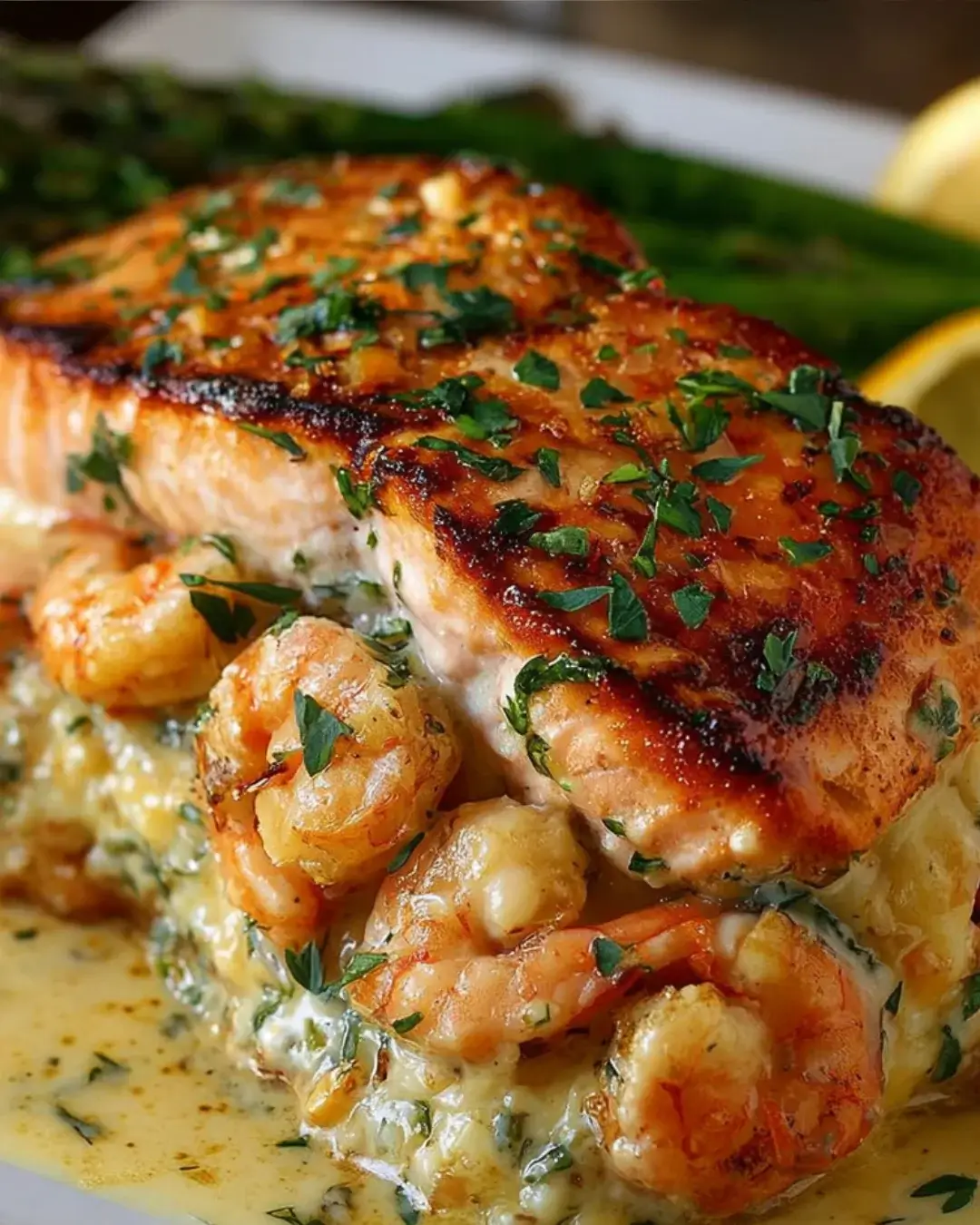 Shrimp-Stuffed Salmon with Lemon Garlic Butter Sauce awaits!