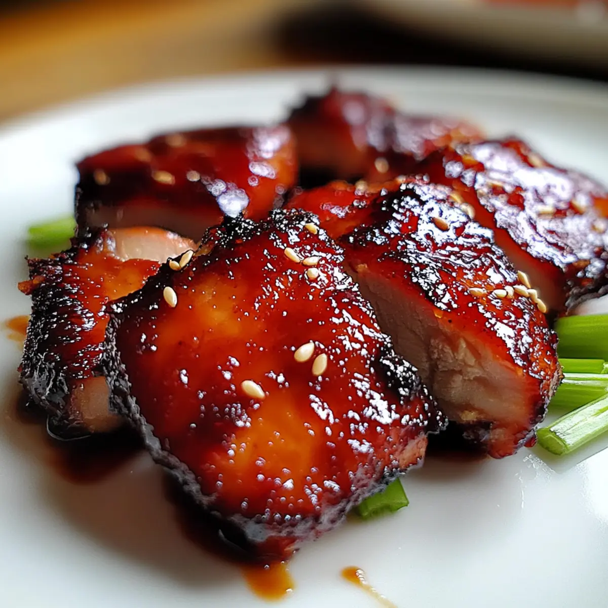 After grilling, allow the chicken to rest for a few minutes to lock in the juices. Then, slice the thighs into strips and arrange them on a serving platter. Sprinkle generously with toasted sesame seeds and sliced green onions to add a bright touch and a crunchy contrast to the sweet-savory glaze. Your aromatic and flavorful Char Siu Chicken is now ready to bring joy to your dinner table!