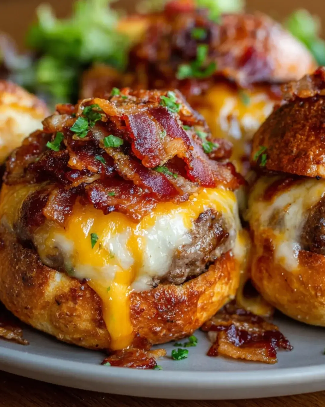 Cheesy Bacon Burger Bombs are delicious bite-sized treats filled with a savory mixture of ground beef, cheddar cheese, and crumbled bacon, all wrapped in flaky biscuit dough.