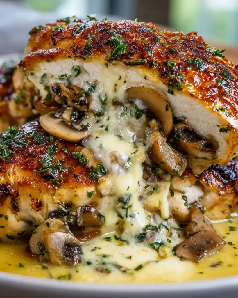 PrintCheesy Garlic Butter Mushroom Stuffed Chicken Recipe Delight!