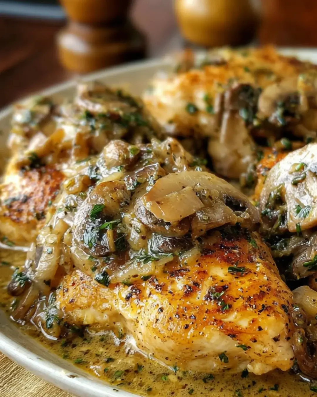 - Serve the chicken topped with the mushroom and onion sauce, garnished with fresh parsley.