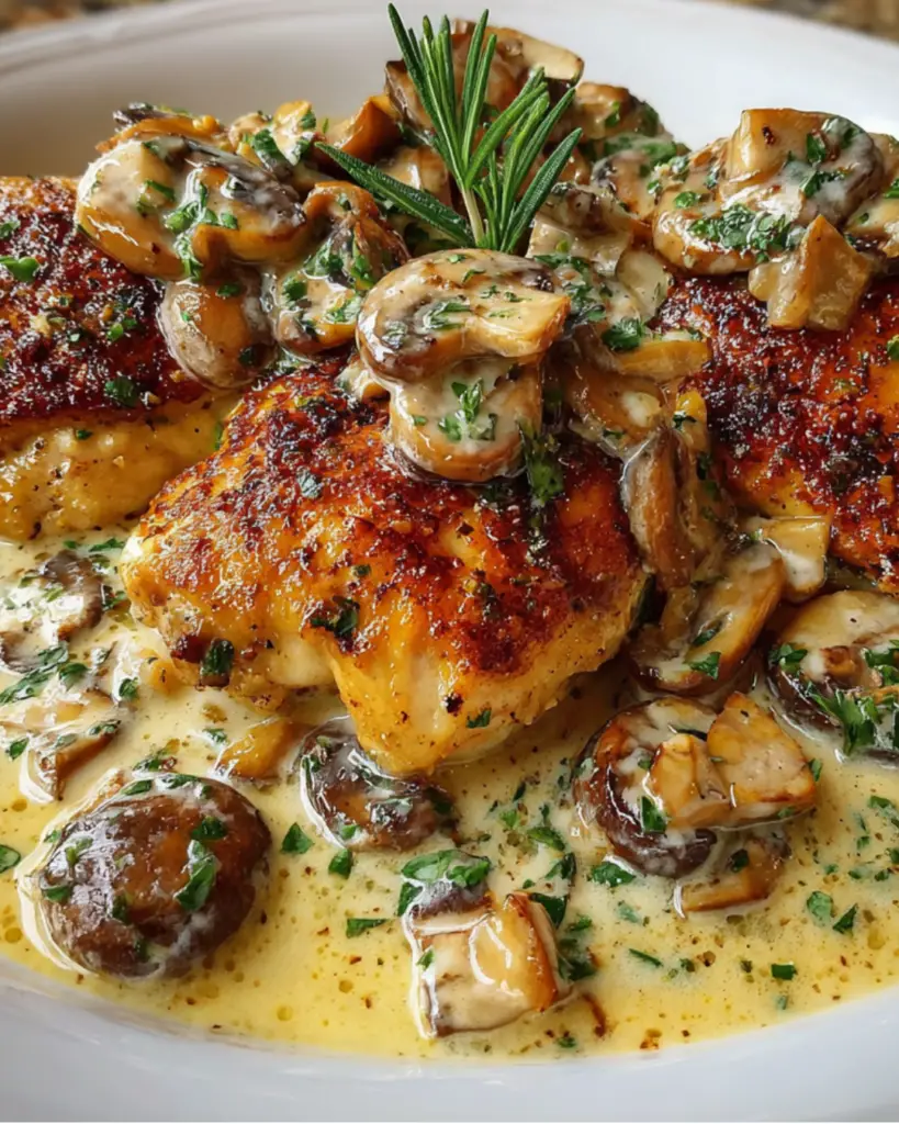 - Return the cooked chicken to the skillet, spooning the mushroom sauce over the top. Cook for an additional 2-3 minutes to heat the chicken through.