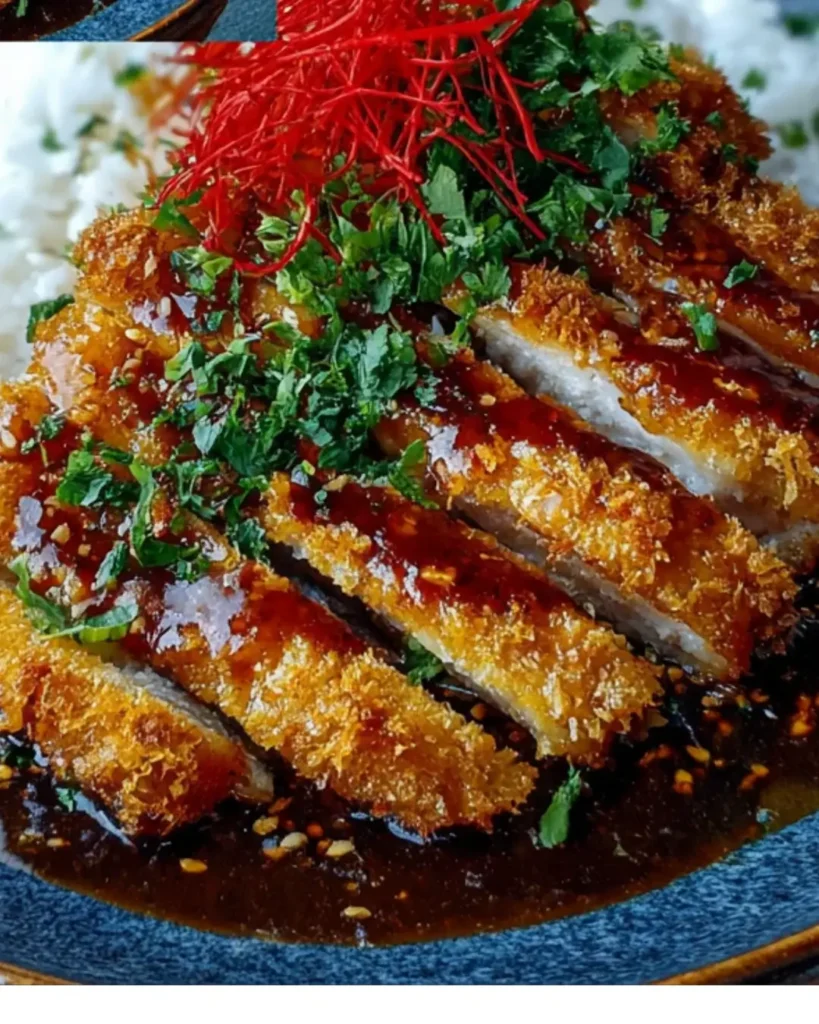 Chicken Katsu Curry is a Japanese dish featuring crispy fried chicken served with a rich curry sauce over rice. It combines the crunch of katsu with the warmth of curry, making it a comforting meal.