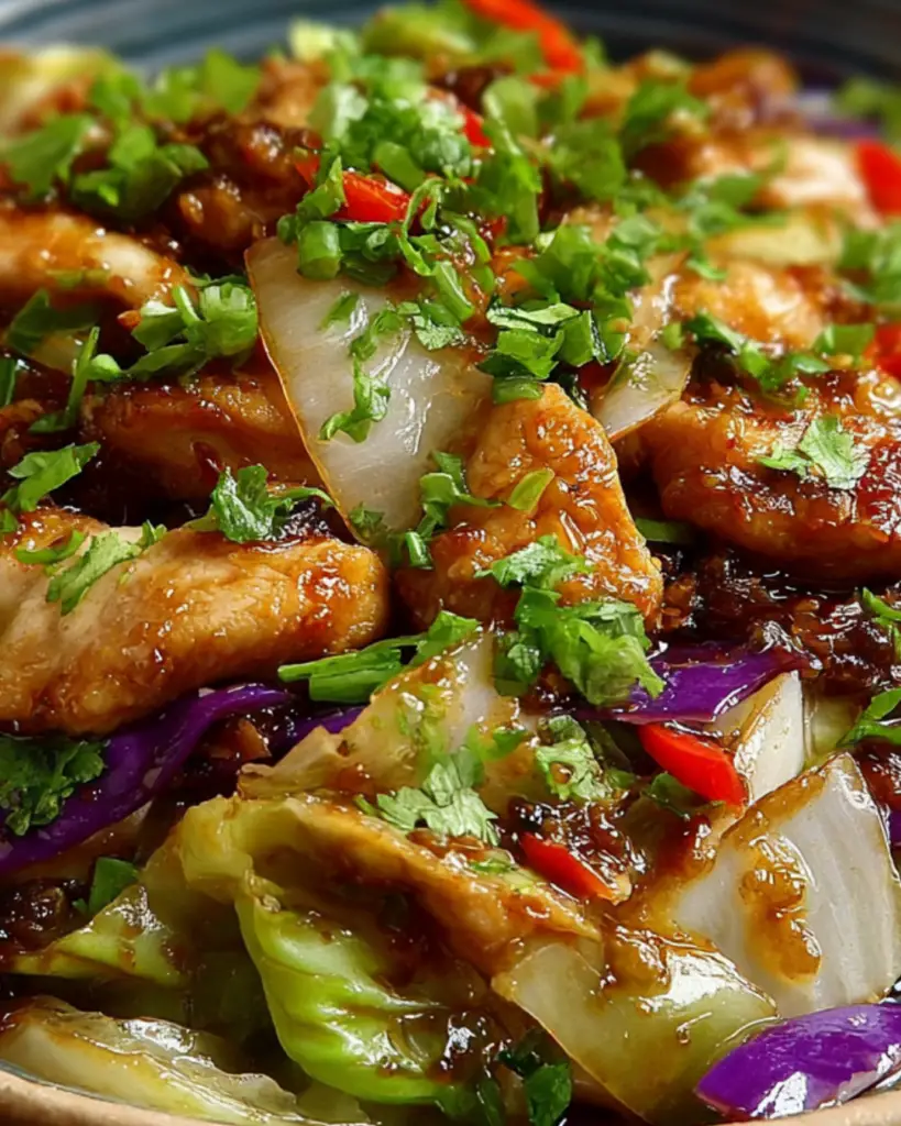 A delicious and healthy stir-fry featuring chicken, onions, and cabbage, perfect for a quick meal.