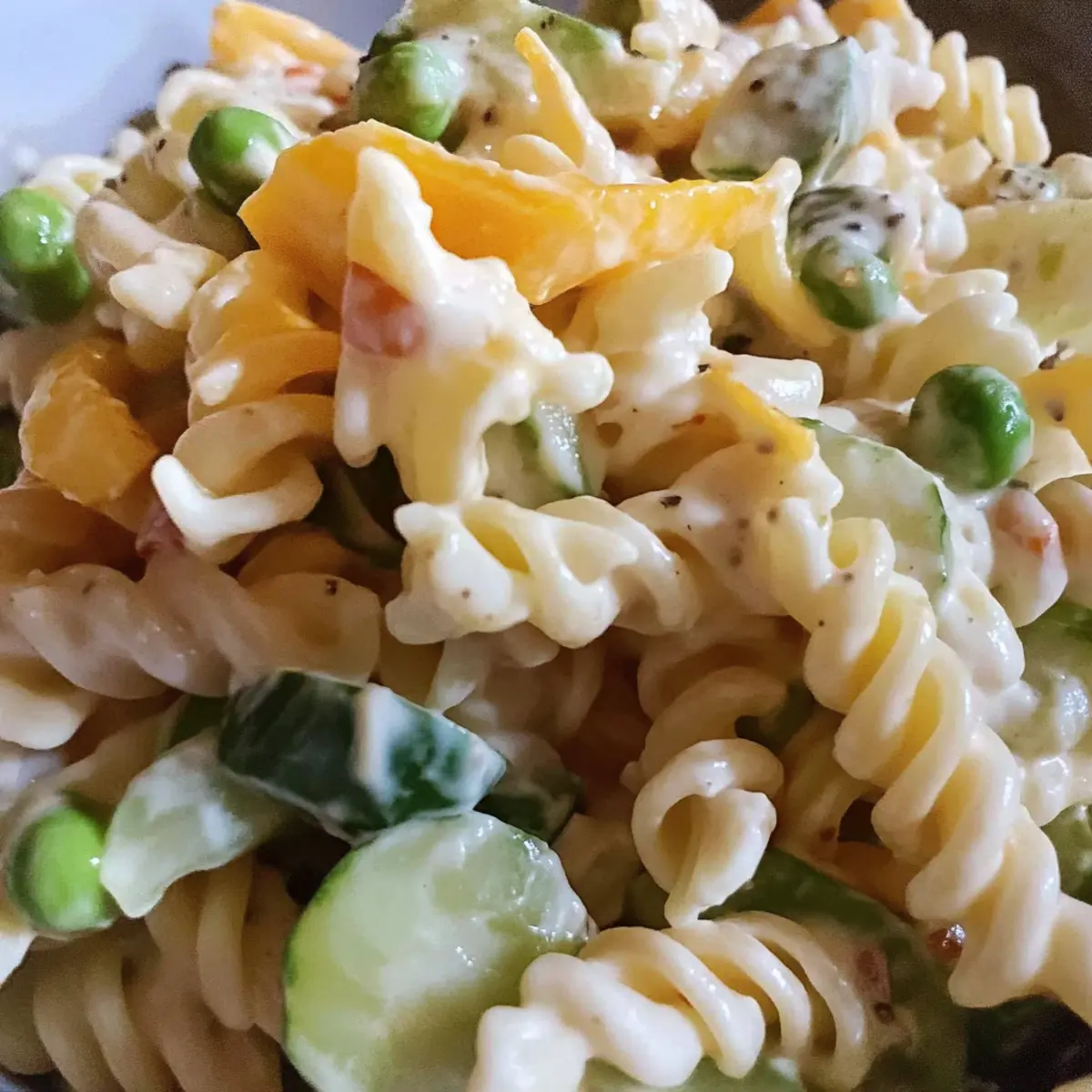 - Add the cooled pasta, diced vegetables, and peas to the dressing, and toss until everything is coated.