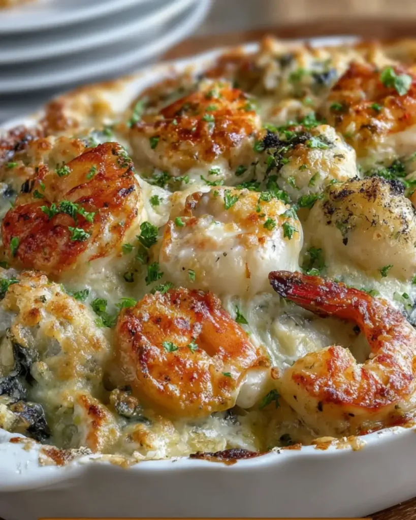 A delicious and creamy seafood gratin made with a mix of shrimp, scallops, and crab meat, topped with Gruyère cheese and breadcrumbs.