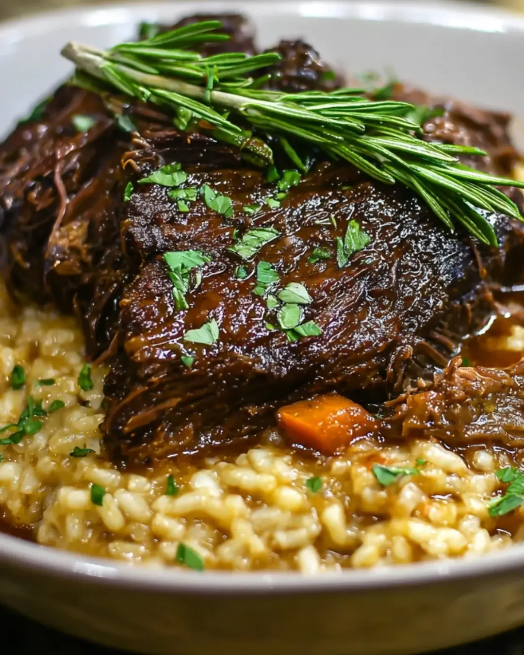 A comforting Italian-inspired pot roast served with creamy risotto, perfect for a cozy dinner.