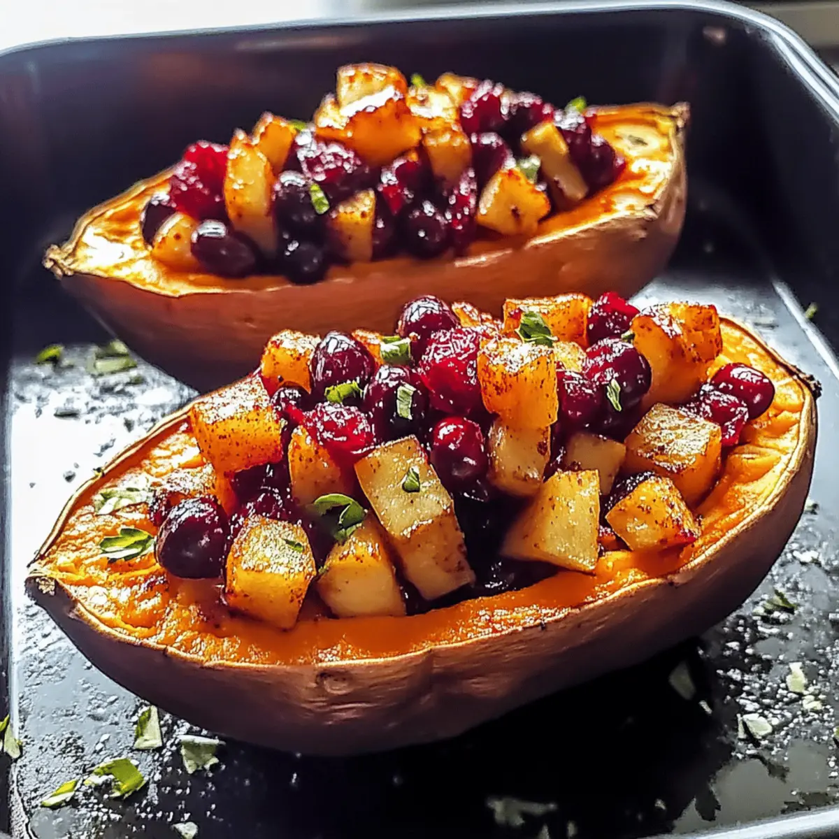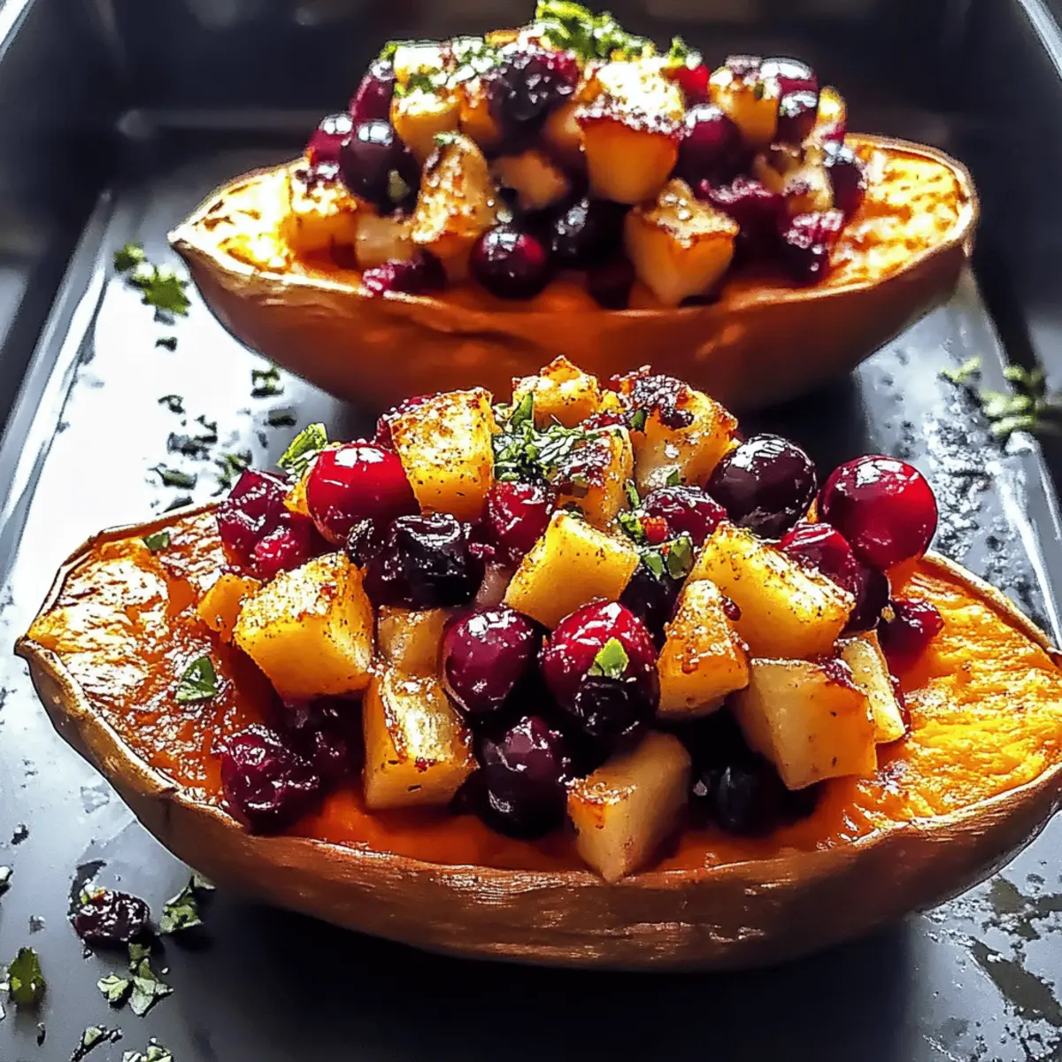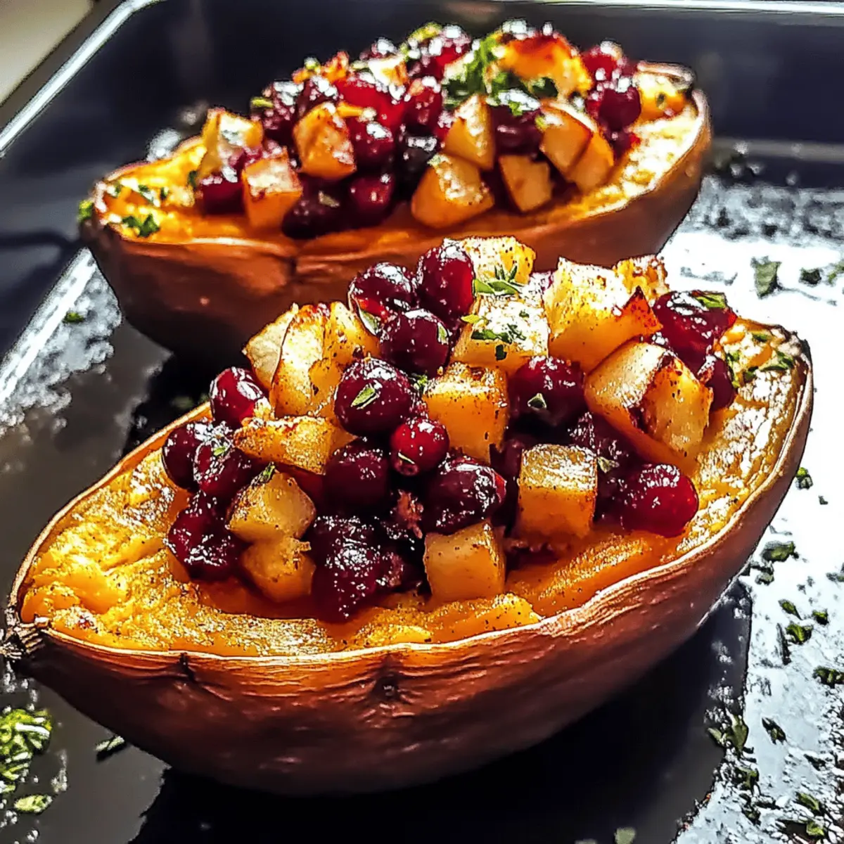 Spoon the sweet potato and filling mixture back into each potato skin, ensuring they are generously filled. To enhance flavor, top each stuffed potato with the remaining apple-cranberry filling, showcasing the colorful, inviting toppings that will shine after baking.