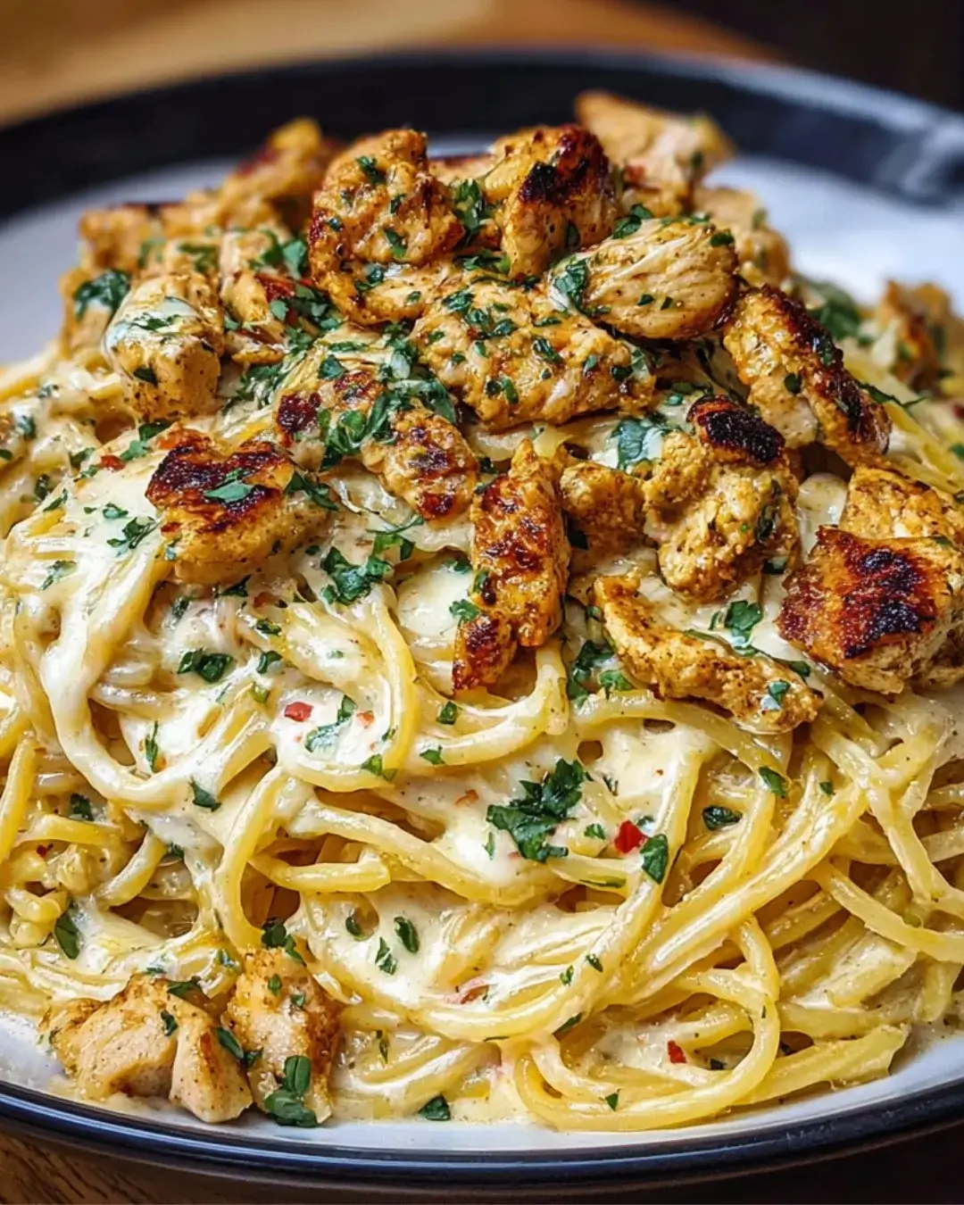 A delicious and creamy pasta dish featuring Cajun-seasoned chicken, spaghetti, and a rich garlic mozzarella sauce.