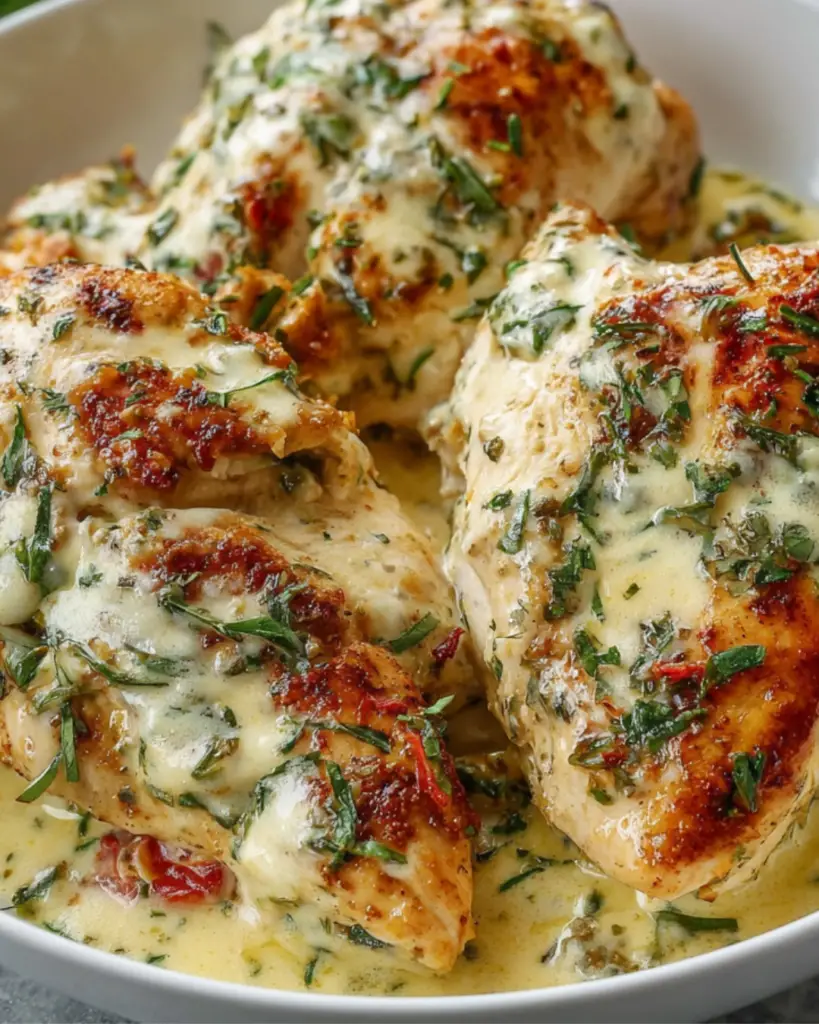 Remove the chicken and set it aside. Now, stir in the heavy cream, grated Parmesan cheese, and chopped sun-dried tomatoes into the pot. Mix everything until smooth and creamy. This sauce is the heart of the dish, so don’t rush it!