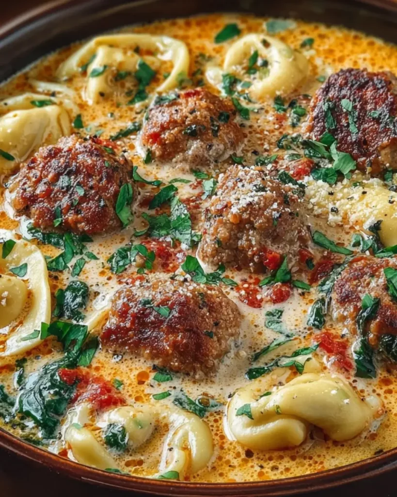 A cozy and hearty soup featuring meatballs, tortellini, and fresh spinach in a creamy broth.