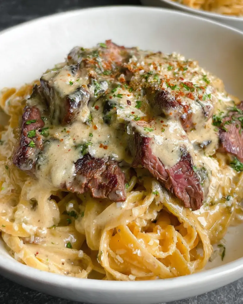 A delicious and creamy steak pasta dish that combines tender sirloin steak with fettuccine pasta in a rich sauce.