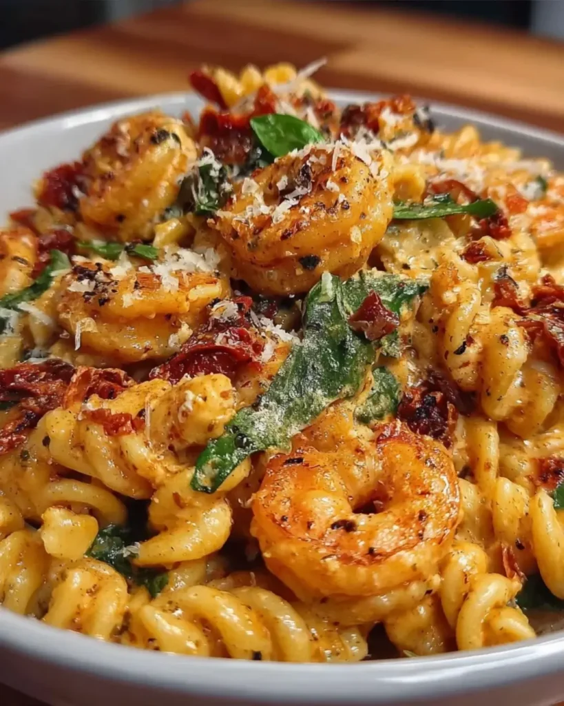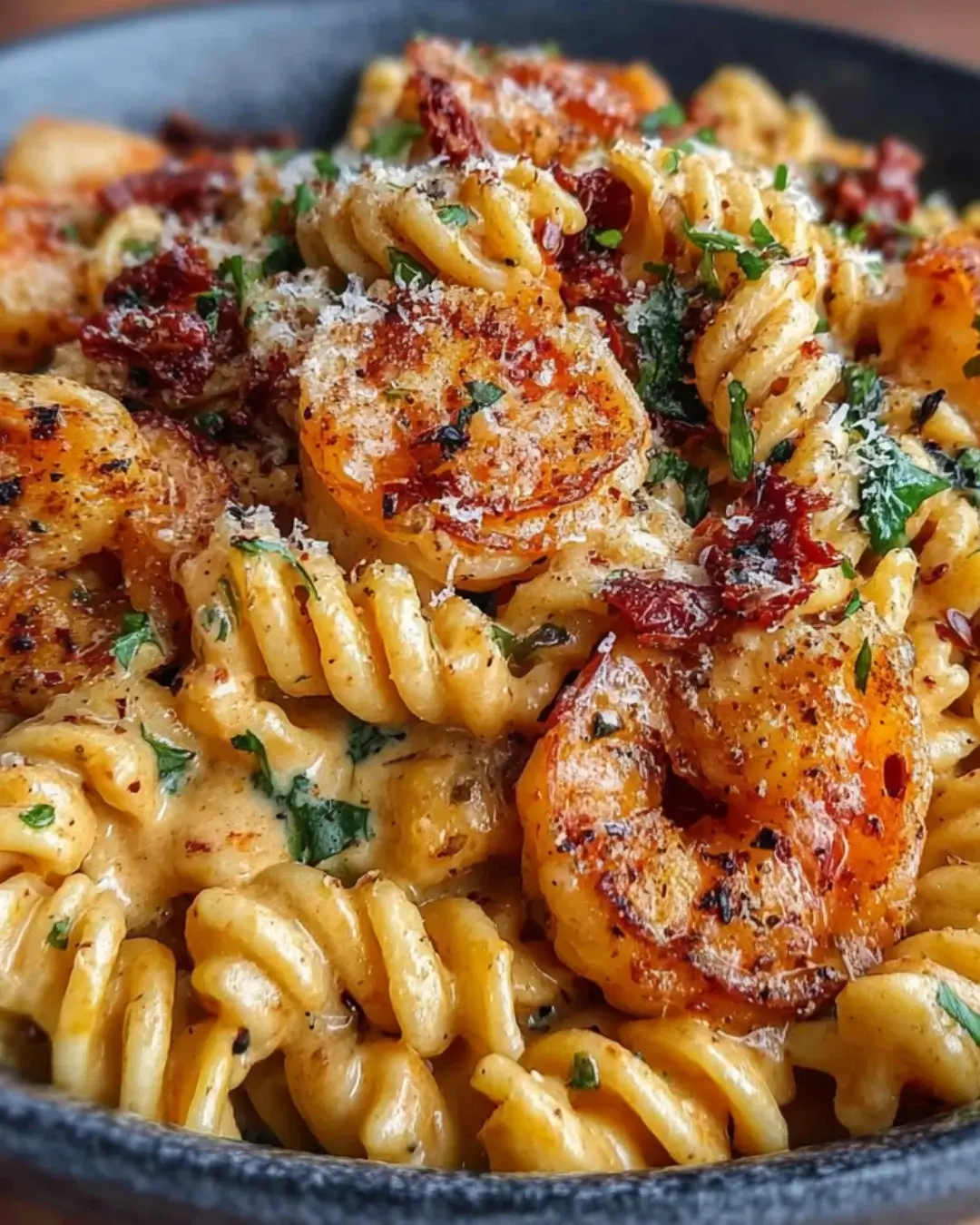 A creamy and flavorful pasta dish featuring succulent shrimp and sun-dried tomatoes, perfect for a delightful meal.