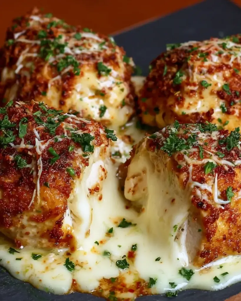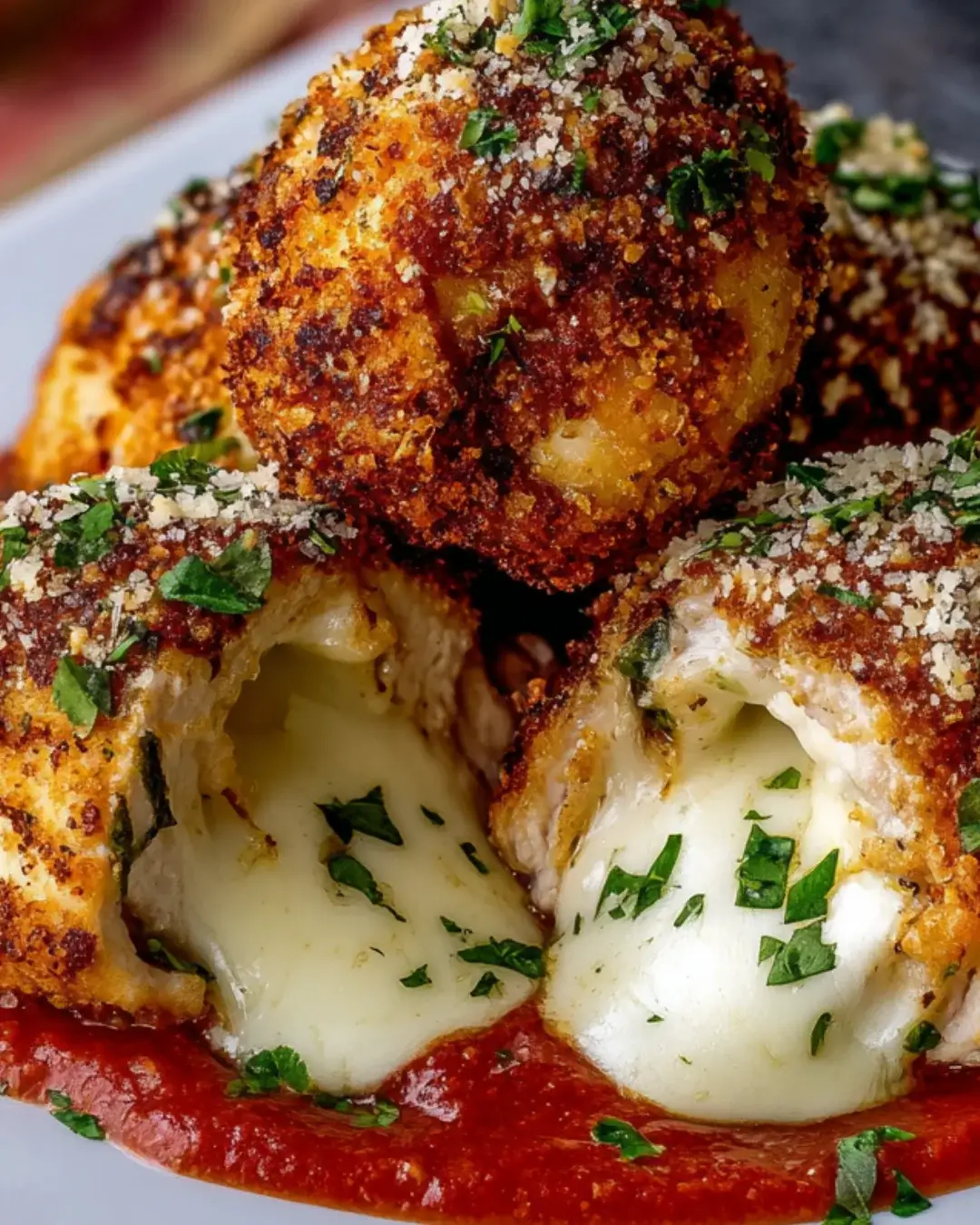 Crispy Mozzarella-Stuffed Chicken Bombs are a delicious and indulgent dish featuring tender chicken breasts filled with gooey mozzarella cheese, breaded and fried to perfection.