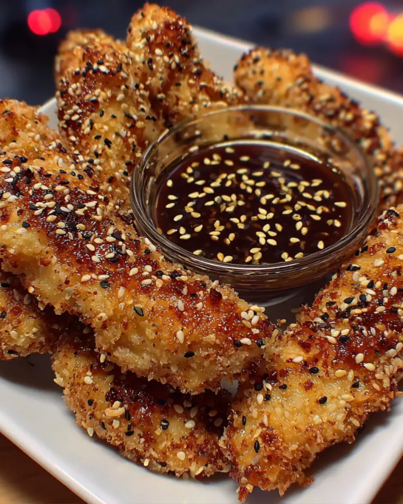 Crispy Sesame Chicken Strips with Honey Soy Dipping Sauce are not just a meal; they’re a delightful experience.