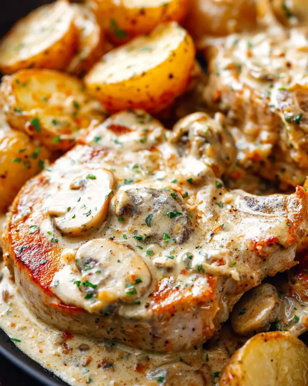 Plus, the creamy garlic sauce envelops the tender pork chops and potatoes, making every bite a delight.