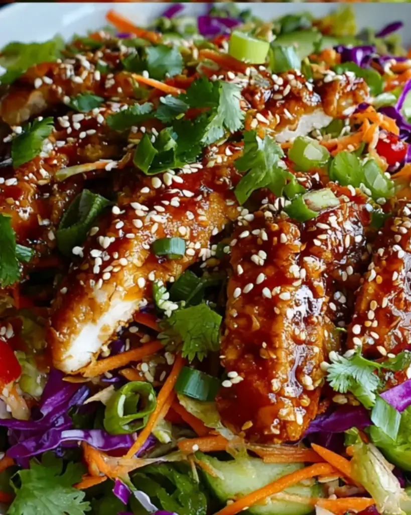 A refreshing and crunchy salad featuring shredded chicken, mixed greens, and a flavorful sesame dressing.