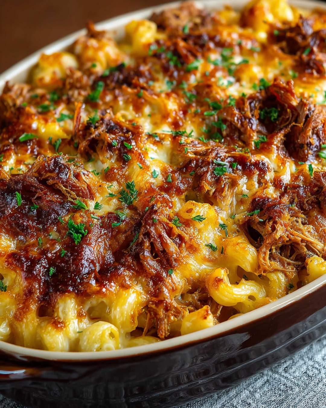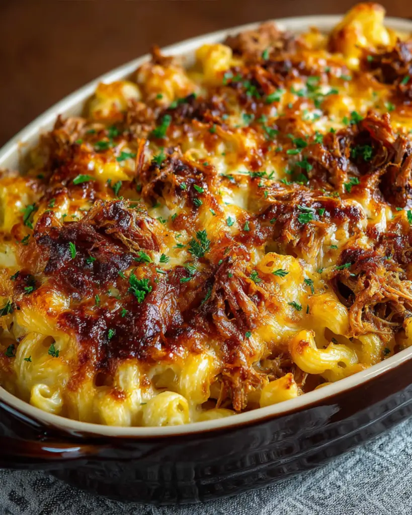 A deliciously rich and creamy mac and cheese dish topped with BBQ pulled pork, perfect for a comforting meal.