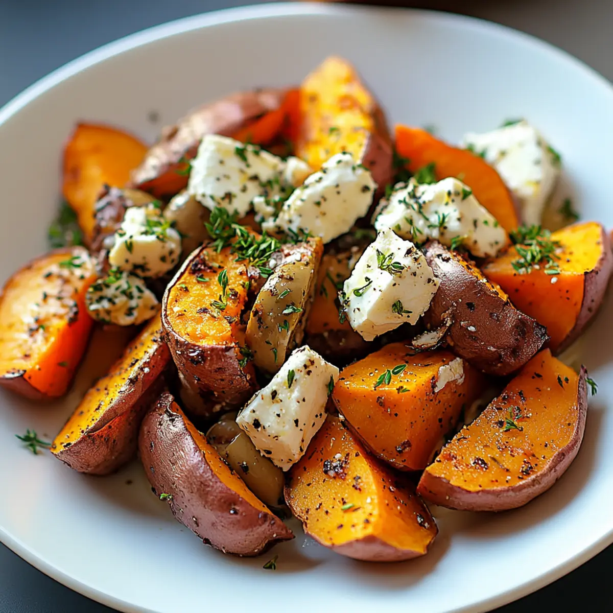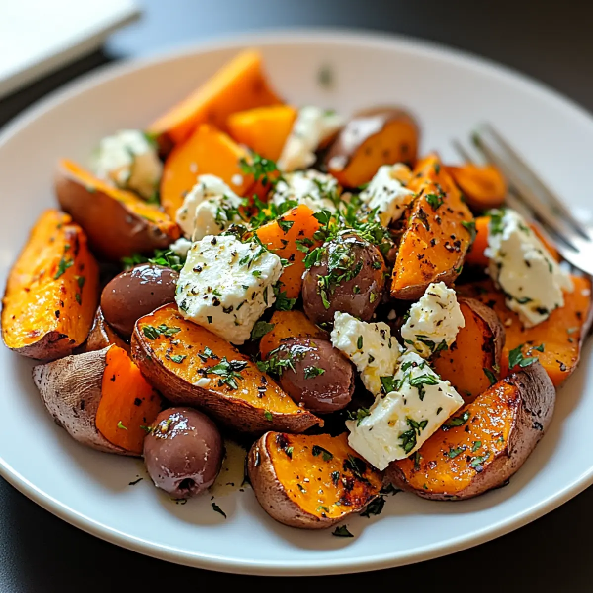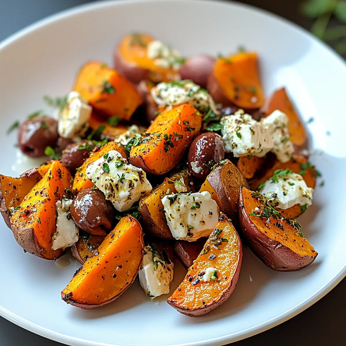 Once the sweet potatoes are perfectly roasted, remove them from the oven and immediately sprinkle the feta cheese and Kalamata olives generously over the top. The warmth of the sweet potatoes will slightly melt the feta, letting those rich Mediterranean flavors mingle together beautifully.