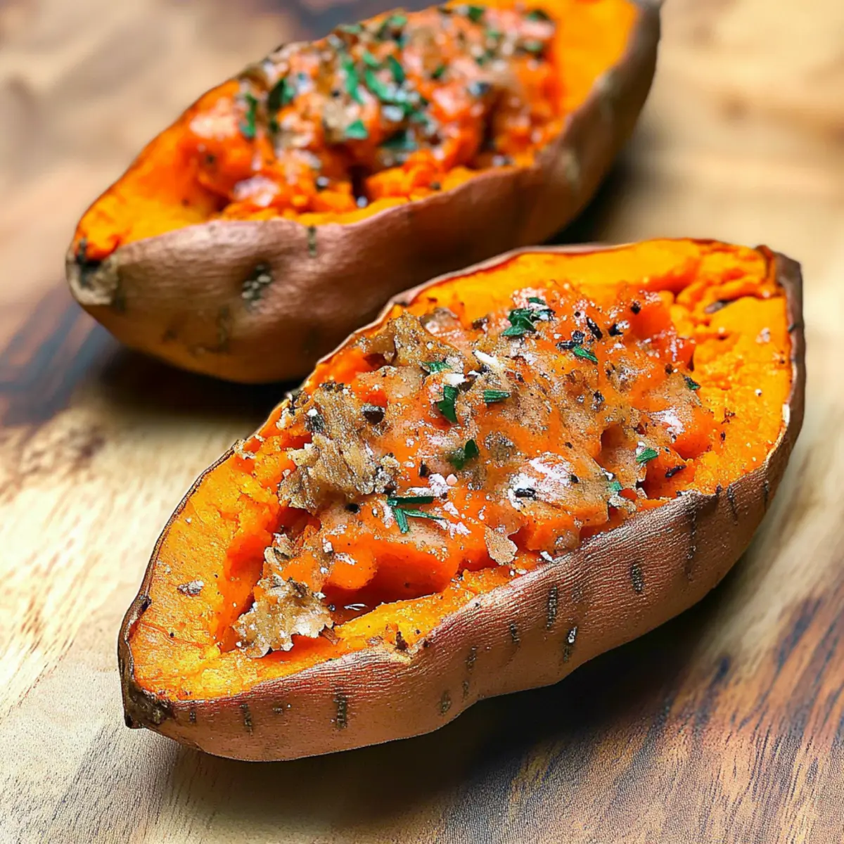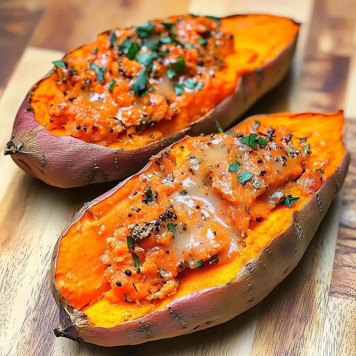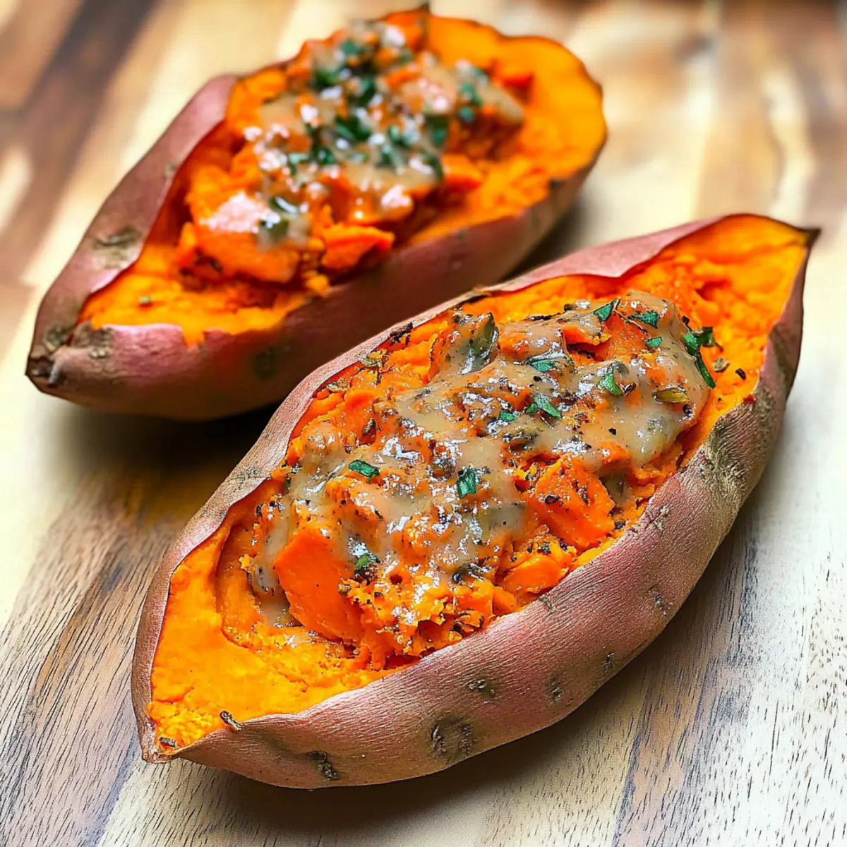 Savory Boost: Enhance your baked sweet potatoes with sautéed garlic and spinach for a nutritious pop of flavor. This combination adds a lovely earthiness and depth, making your dish even more satisfying.