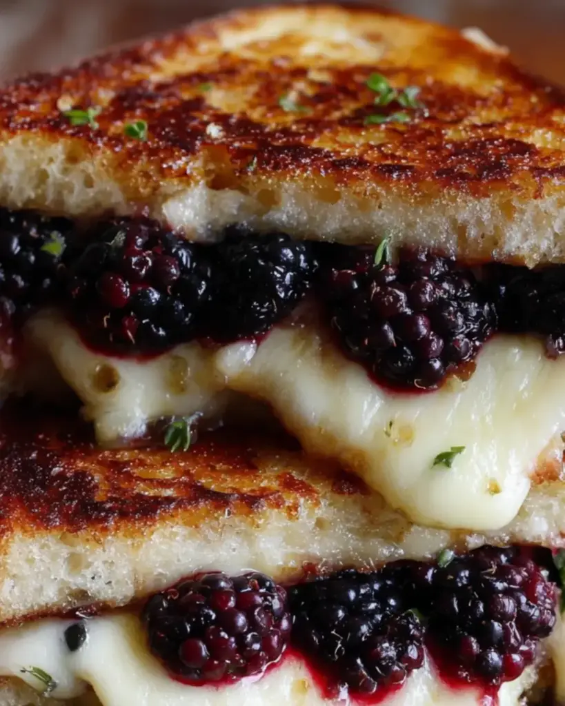 A delightful twist on a classic grilled cheese sandwich featuring creamy Brie cheese and sweet blackberries.