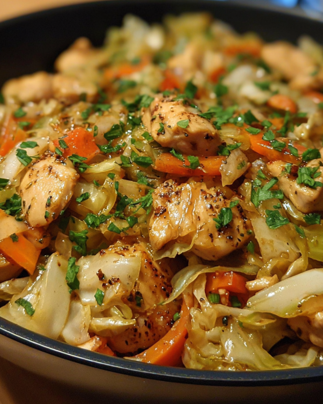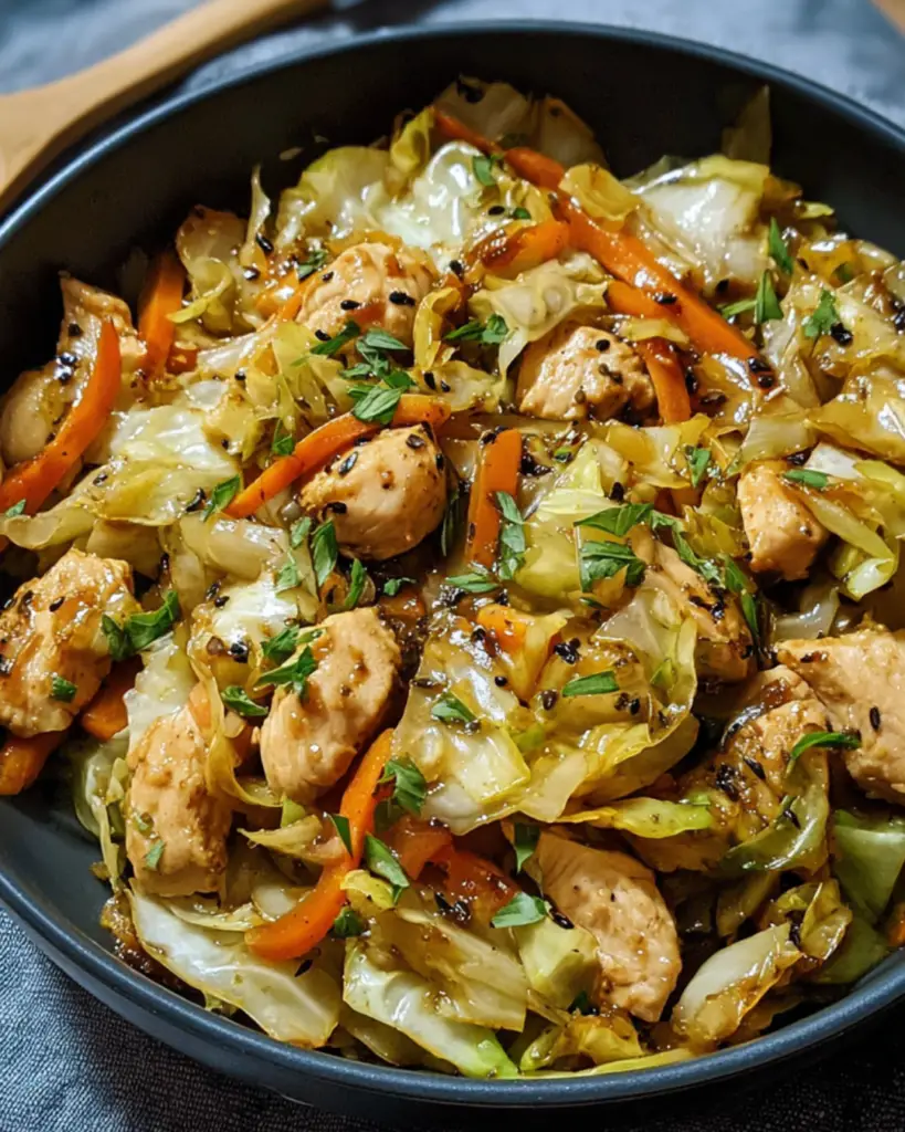A quick and budget-friendly stir fry featuring chicken and cabbage, perfect for a weeknight dinner.