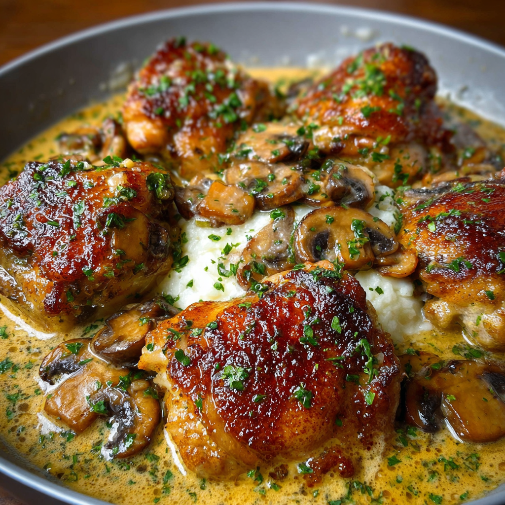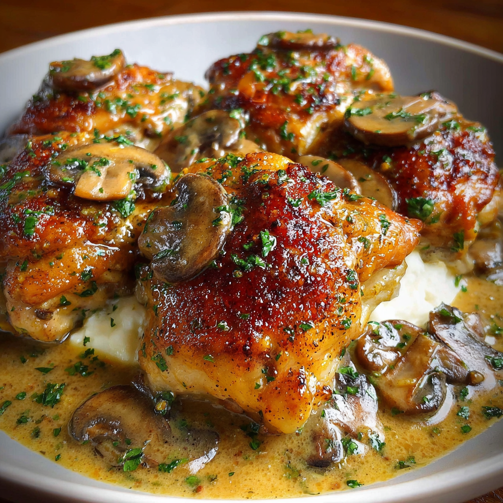 A delicious and creamy dish featuring chicken thighs cooked in a rich garlic mushroom sauce.