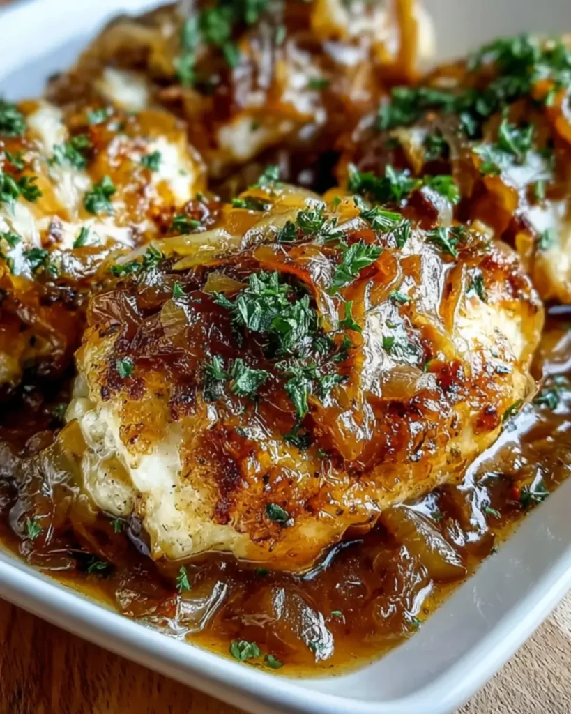 A delicious and easy recipe for French Onion Chicken, featuring caramelized onions and melted Gruyère cheese.