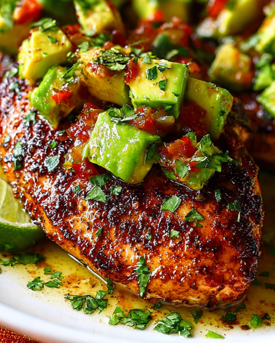 A flavorful grilled chicken dish marinated in lime and spices, topped with a fresh avocado mixture.