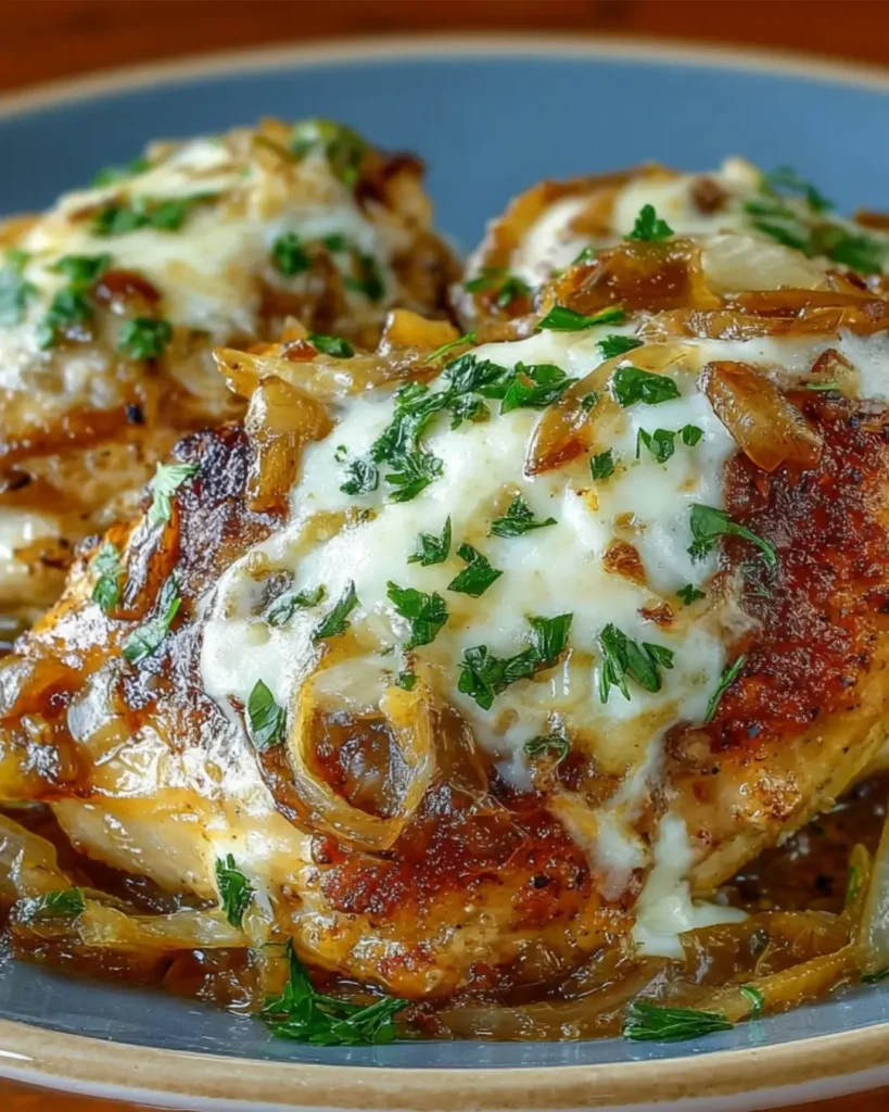 A delicious and savory French Onion Chicken recipe featuring tender chicken breasts topped with caramelized onions and melted Gruyère cheese.