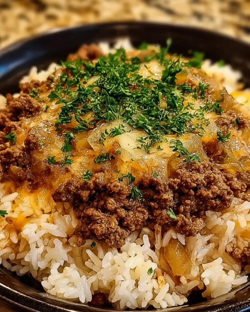 It’s a hearty dish that combines savory ground beef, tender rice, and sweet, caramelized onions, all topped with gooey Swiss cheese.