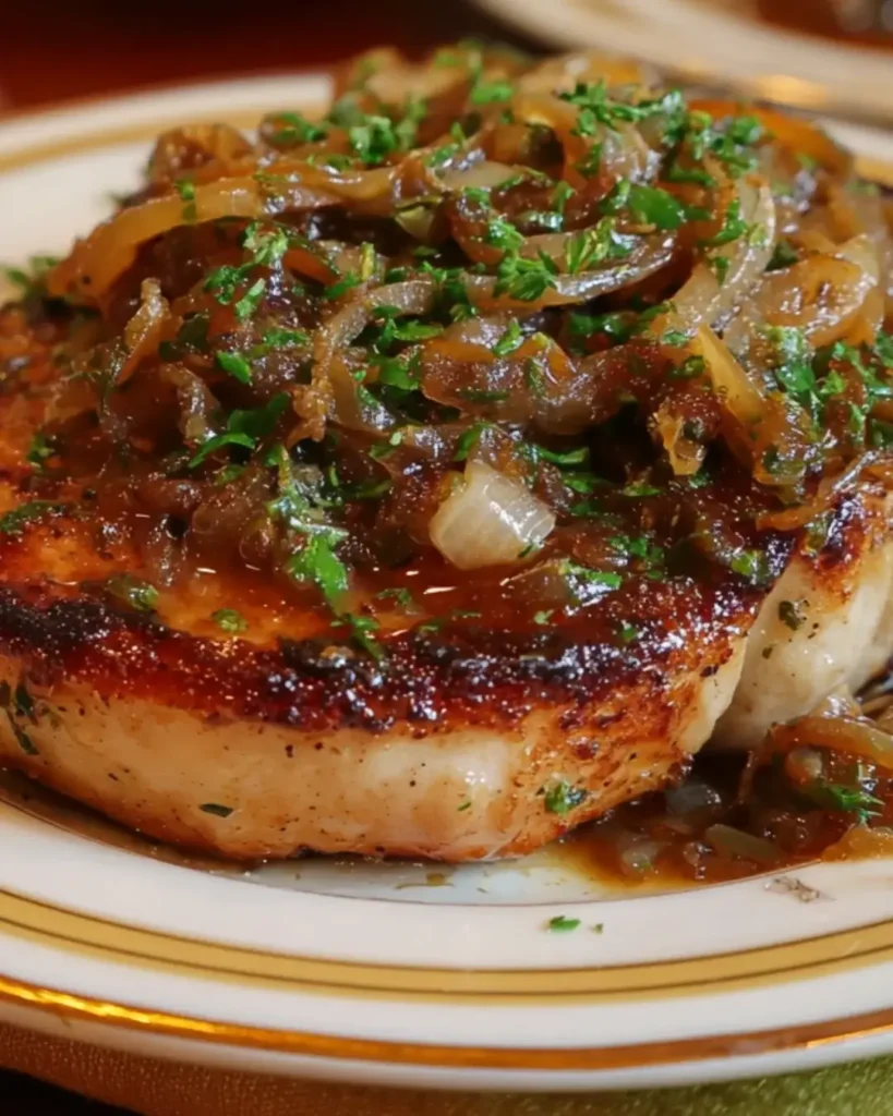 A delicious and savory French Onion Pork Chop recipe that combines tender pork chops with caramelized onions and melted Gruyère cheese.