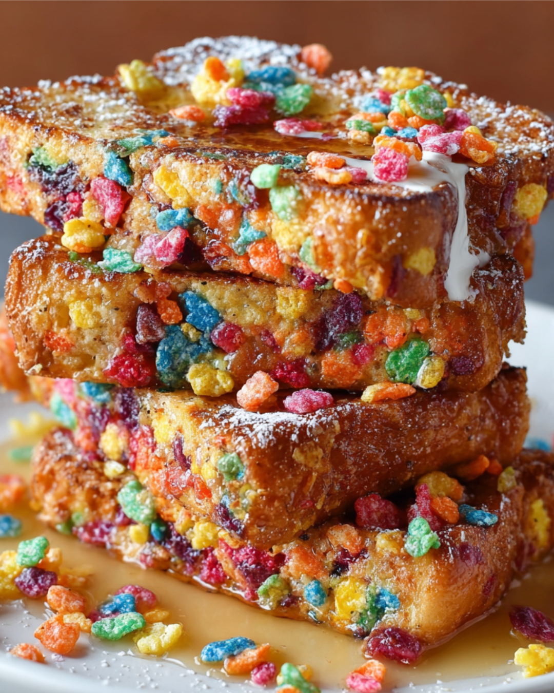 Once cooked, remove the French toast from the skillet and serve it warm. Drizzle with maple syrup for that classic touch. You can even add a sprinkle of powdered sugar on top for an extra special presentation. Enjoy every colorful bite of your Fruity Pebbles French Toast!