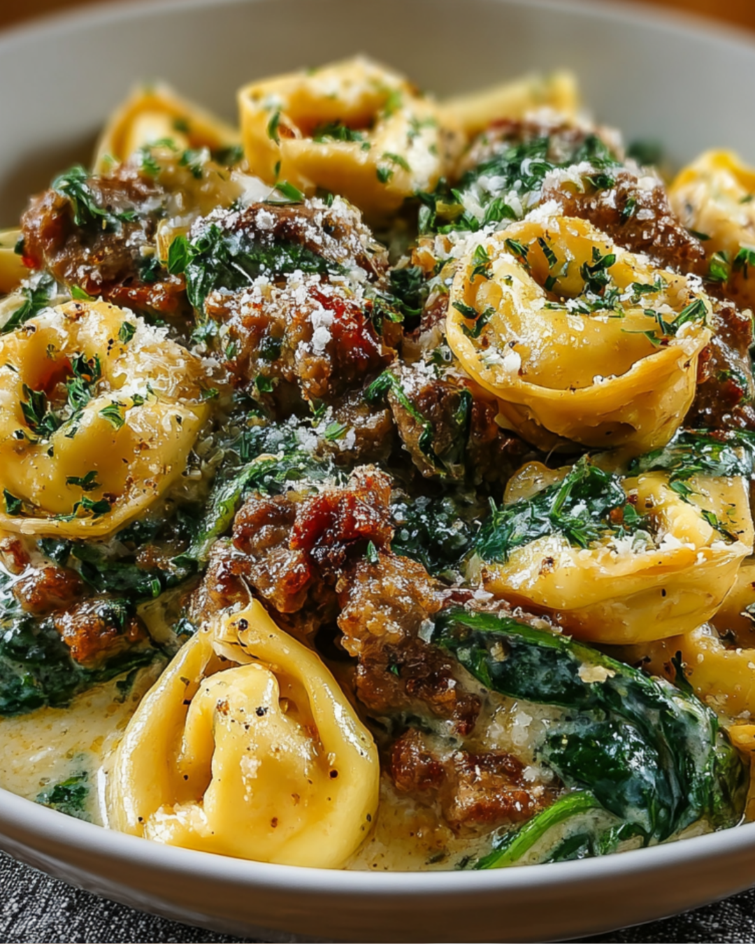 A delicious Garlic Butter Tortellini in Creamy Sauce featuring beef, Italian sausage, and fresh spinach.
