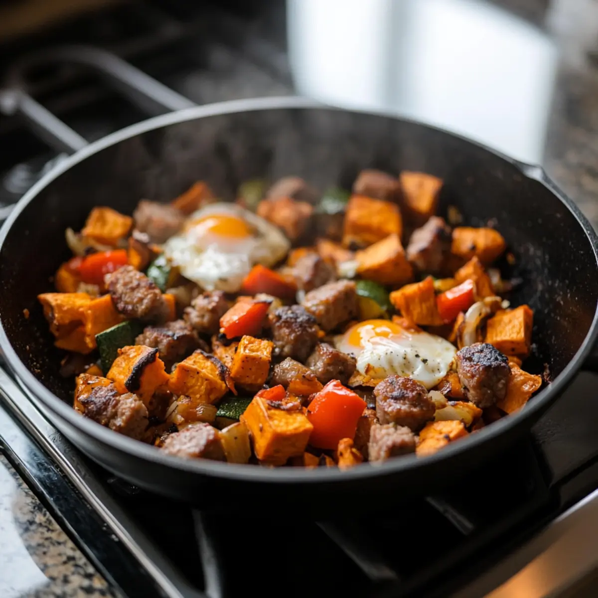 Using a spoon, make small wells in the hash and crack an egg into each well. Cover the skillet with a lid and cook for about 4-6 minutes, or until the egg whites are set but the yolks remain runny. This creates a beautiful sunny-side-up effect that perfectly complements the hash.