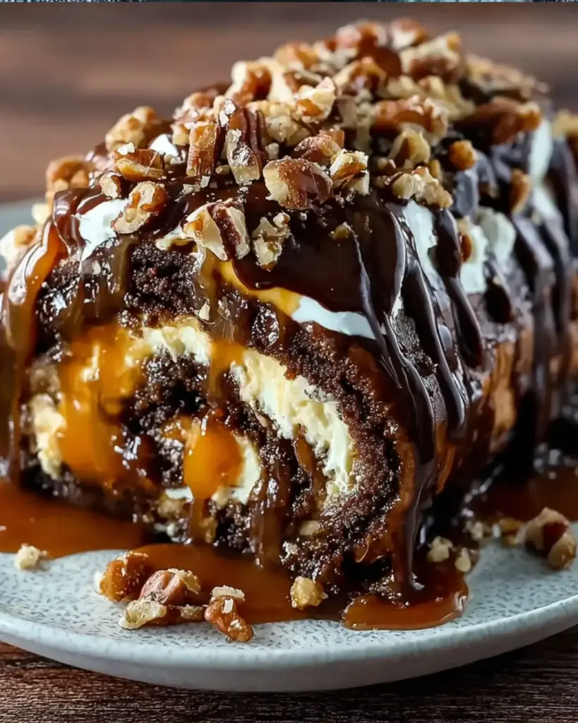 A deliciously rich and gooey chocolate cake roll filled with caramel and topped with pecans, perfect for dessert lovers.