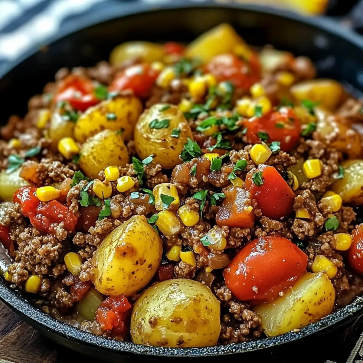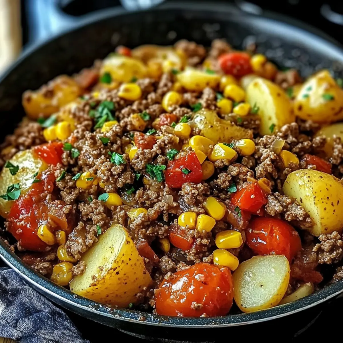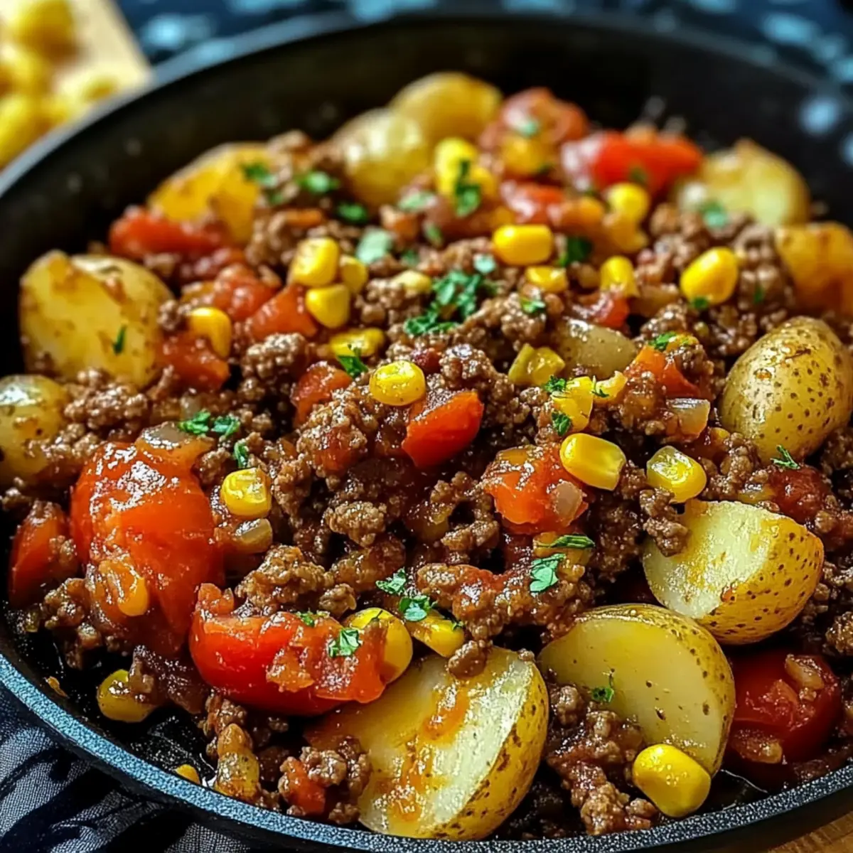 Hearty and Flavorful: Enjoy a delicious blend of seasoned ground beef, tender potatoes, and a burst of sweetness from the corn and tomatoes. It’s like a warm hug in a skillet!
