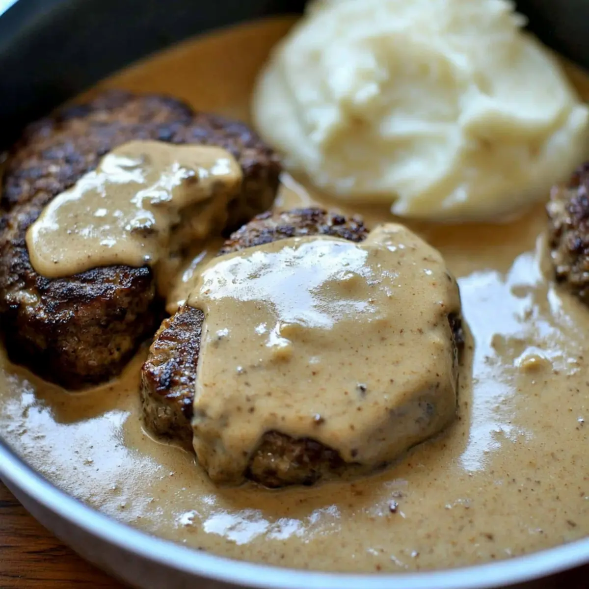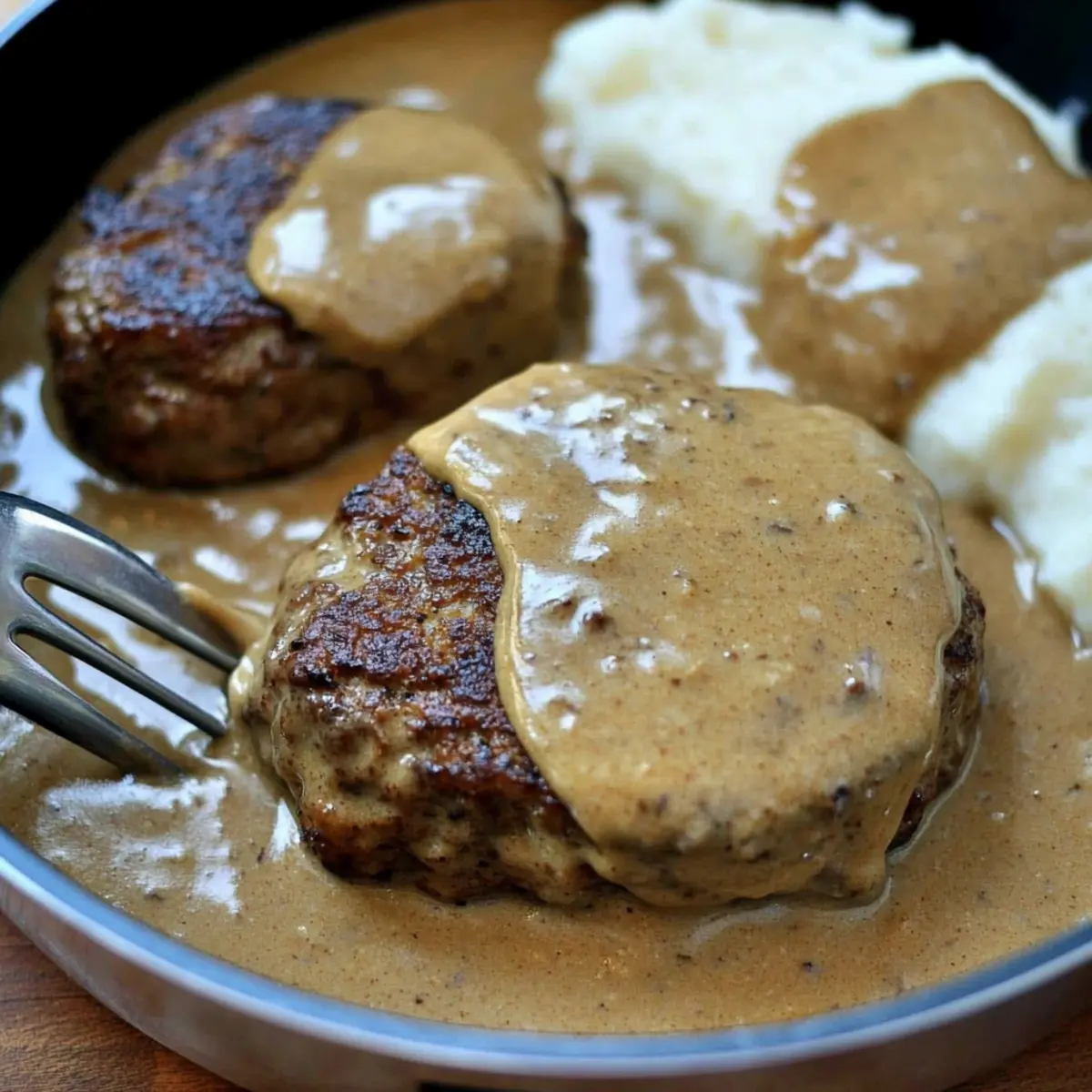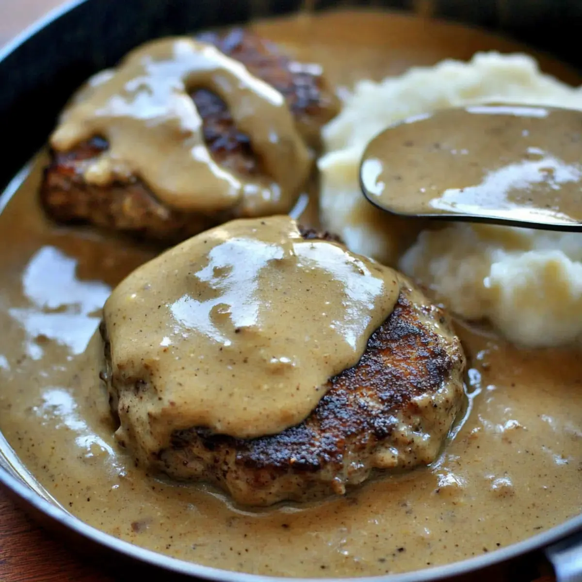 - Return the browned patties to the skillet, spooning gravy over them. Simmer for 2-3 minutes before serving over mashed potatoes or egg noodles.