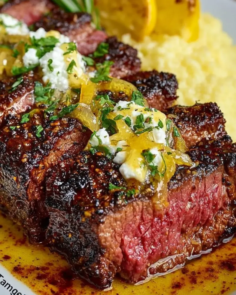 A flavorful Harissa Marinated Beef Tenderloin served with tangy pickled lemon, perfect for a delicious meal.